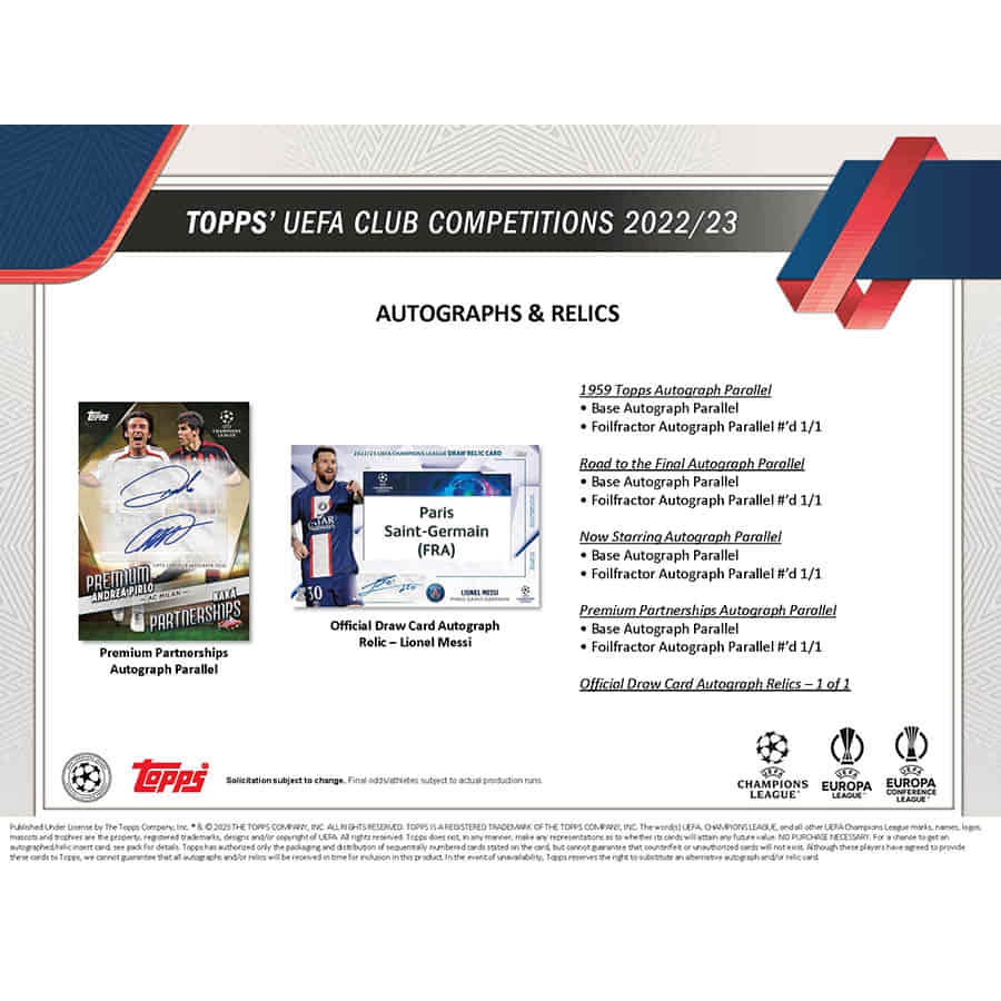 Look out for autograph cards and search for Official UCL Draw Card Autograph Relics featuring authentic draw cards from the 2021/22 UEFA Champions League competition draw, combined with autographs of the biggest names.
