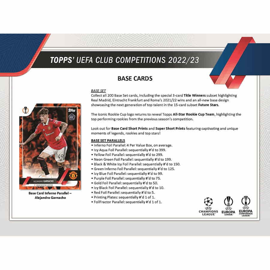 BASE CARDS: Collect all 200 Base Set cards, including the special 3-card Title Winners subset highlighting Real Madrid, Eintracht Frankfurt and Roma's 2021/22 wins and an all-new base design showcasing the next generation of top talent in the 15-card subset Future Stars.