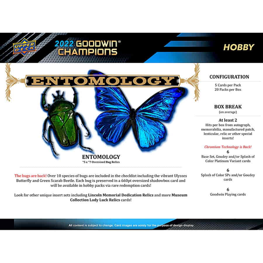 The Bugs are Back! Over 10 species of bugs are included in the Entomology checklist including the vibrant Ulysses Butterfly and Green Scarab Beetle. Each bug is preserved in a 660pt oversized shadowbox card and will be available in boxes via rare redemption cards!