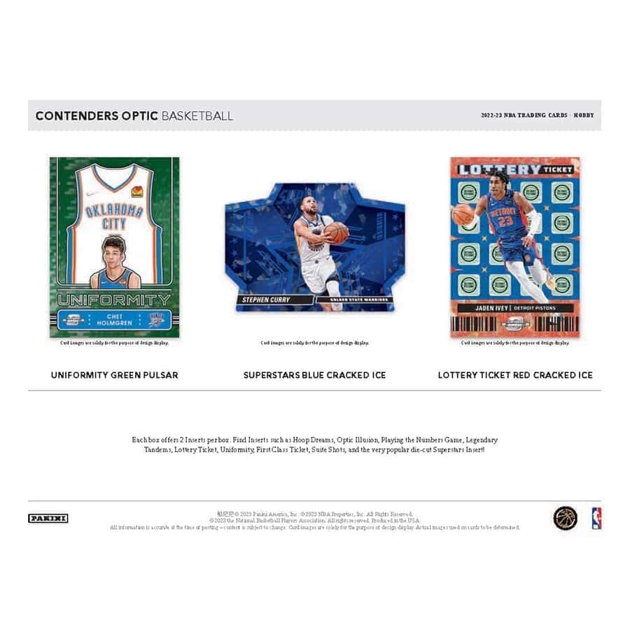 UNIFORMITY / SUPERSTARS / LOTTERY TICKET: Each box offers 2 Inserts per box. Find Inserts such as Hoop Dreams, Optic Illusion, Playing the Numbers Game, Legendary Tandems, Lottery Ticket, Uniformity, First Class Ticket, Sutie Shots and the very popular die-cut Superstars Insert!