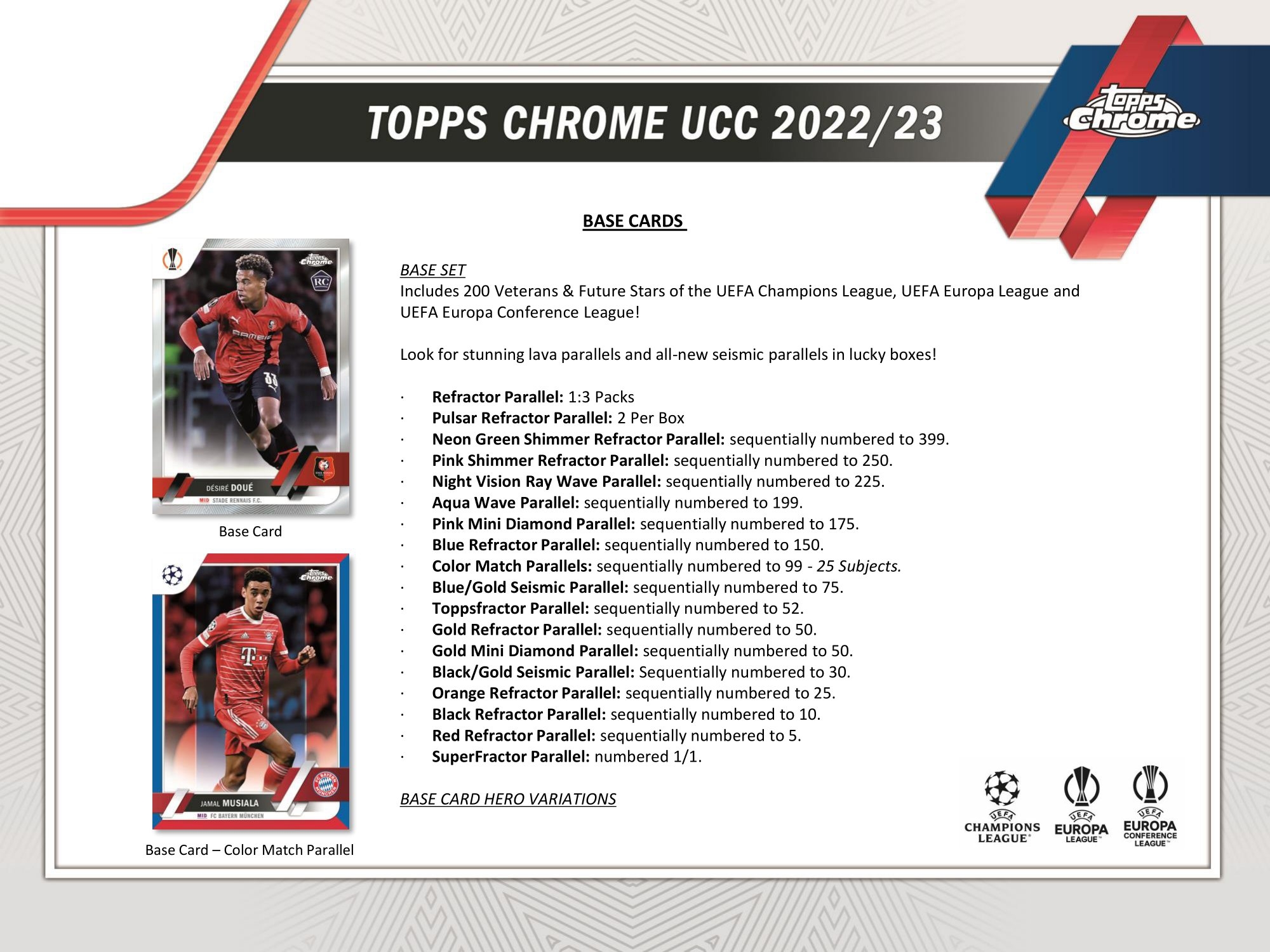 The base set for 2022-23 Topps Chrome UEFA Club Competitions offers 200 cards and multiple parallels.