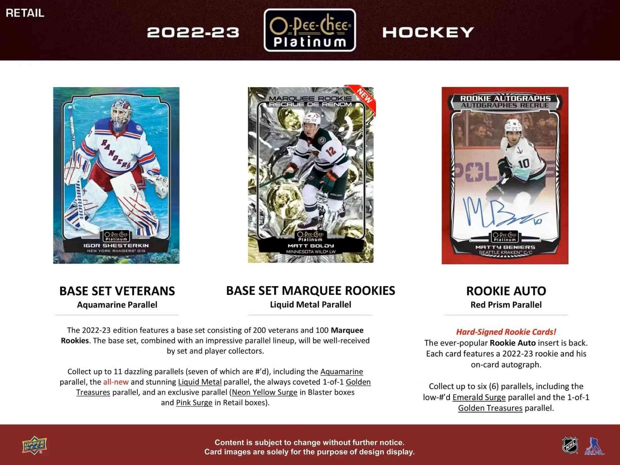 The 2022-23 edition features a base set consisting of 200 veterans and 100 Marquee Rookies. The base set, combined with an impressive parallel lineup, will be well-received by set adn player collectors.