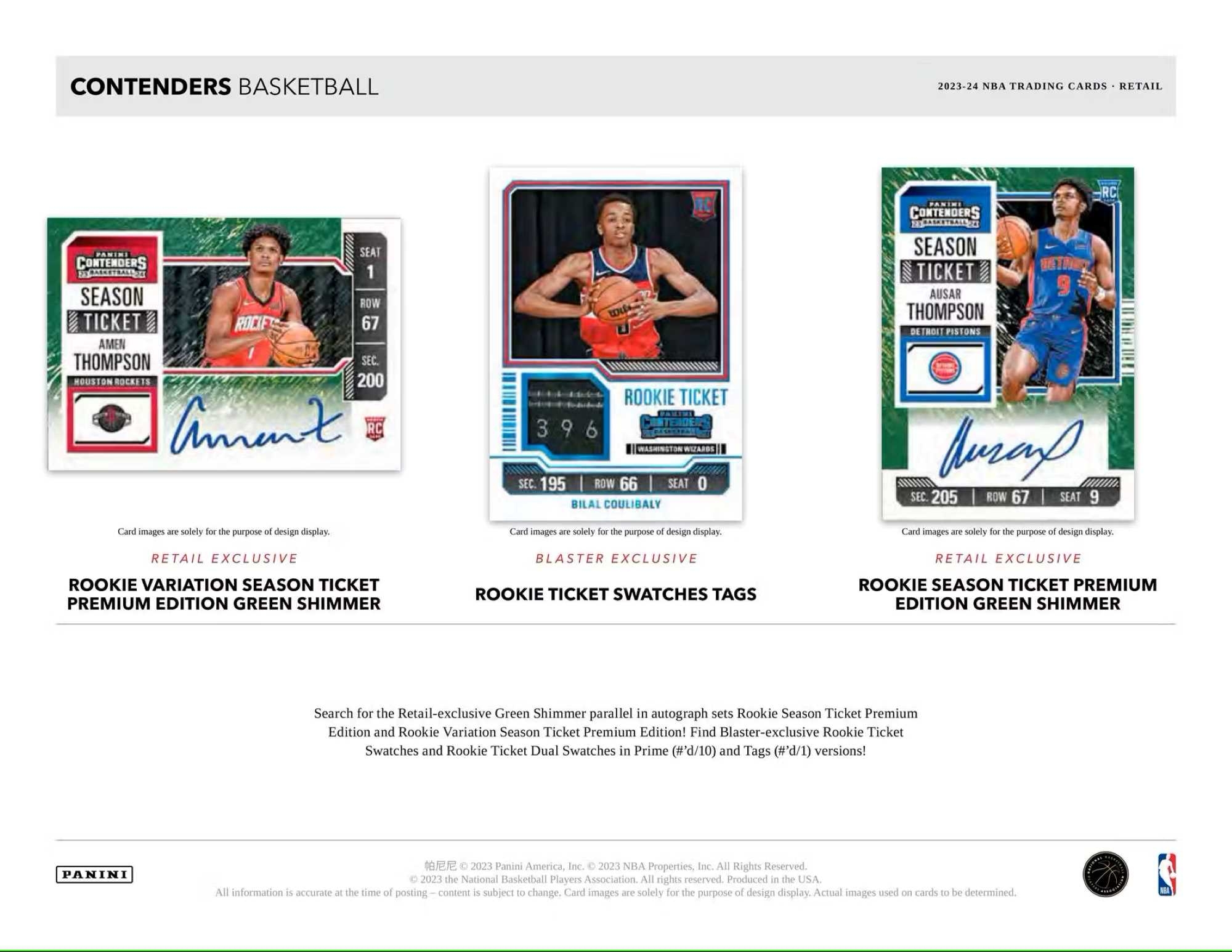 ROOKIE TICKET: Search for the Retail-exclusive Green Shimmer parallel in autograph sets Rookie Season Ticket Premium Edition and Rookie Variation Season Ticket Premium Edition! Find Blaster-exclusive Rookie Ticket Swatches and Rookie Ticket Dual Swatches in Prime (#'d/10) and Tags (#'d/1) versions!