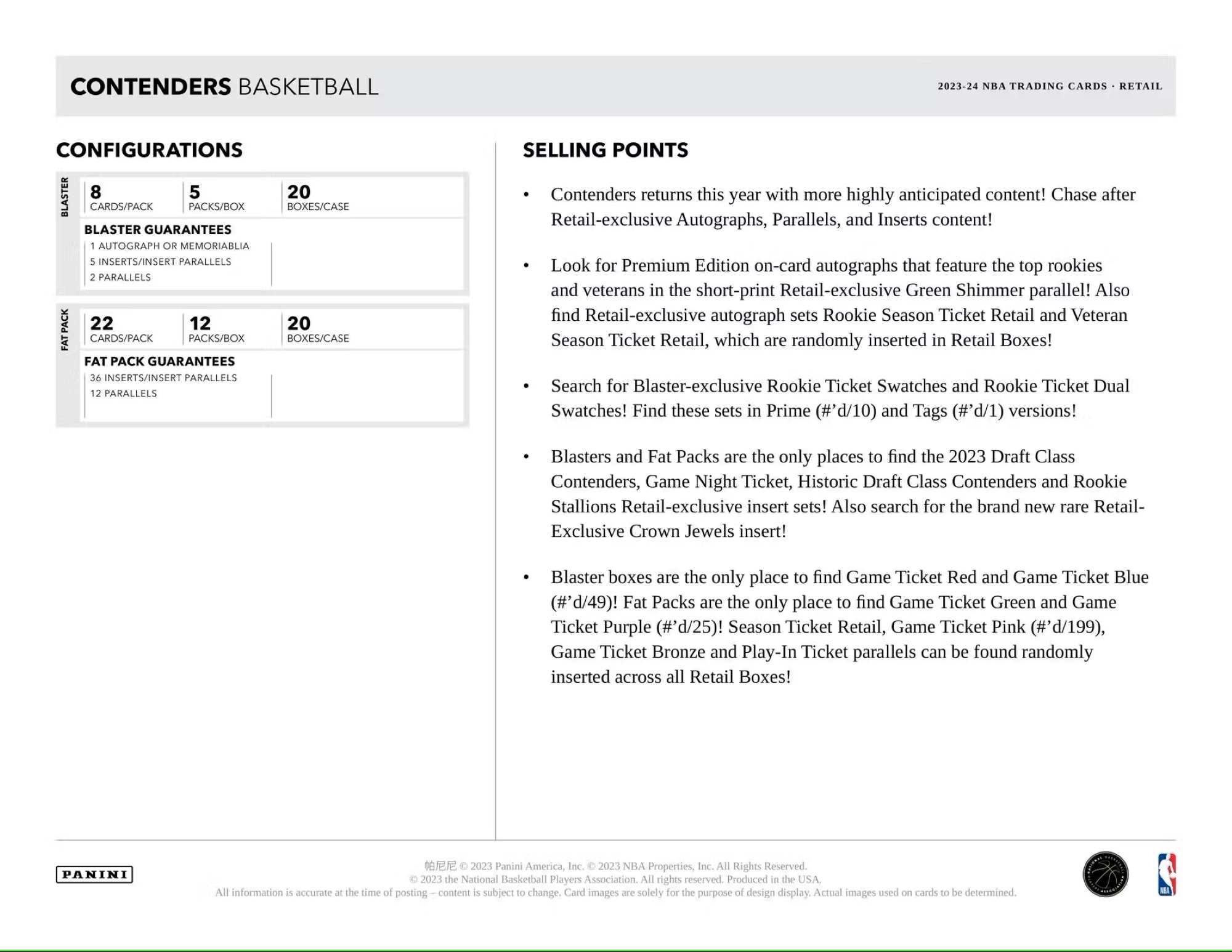 Blaster boxes are the only place to find Game Ticket Red and Game Ticket Blue (#'d/49)! Fat Packs are the only place to find Game Ticket Green and Game Ticket Purple (#'d/25)! Season Ticket Retail, Game Ticket Pink (#'d/199), Game Ticket Bronze and Play-In Ticket parallels can be found randomly inserted across all Retail Boxes!