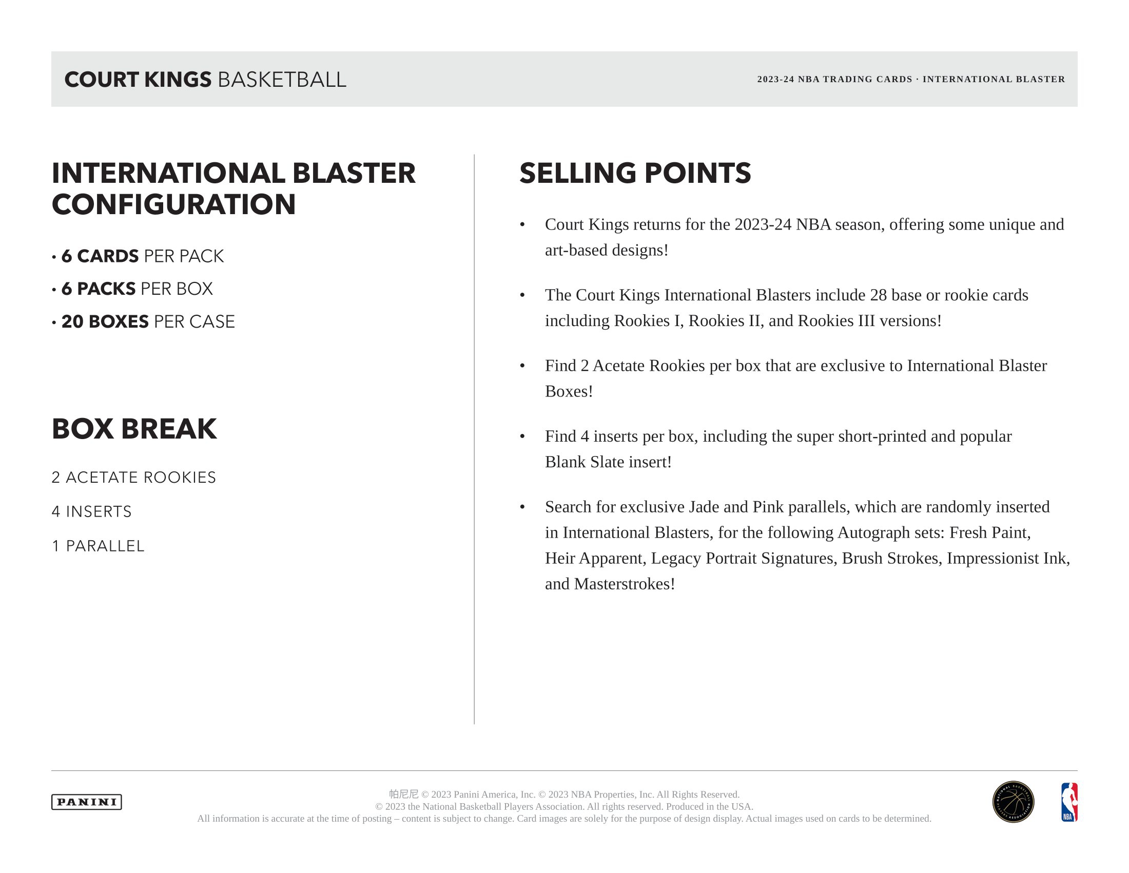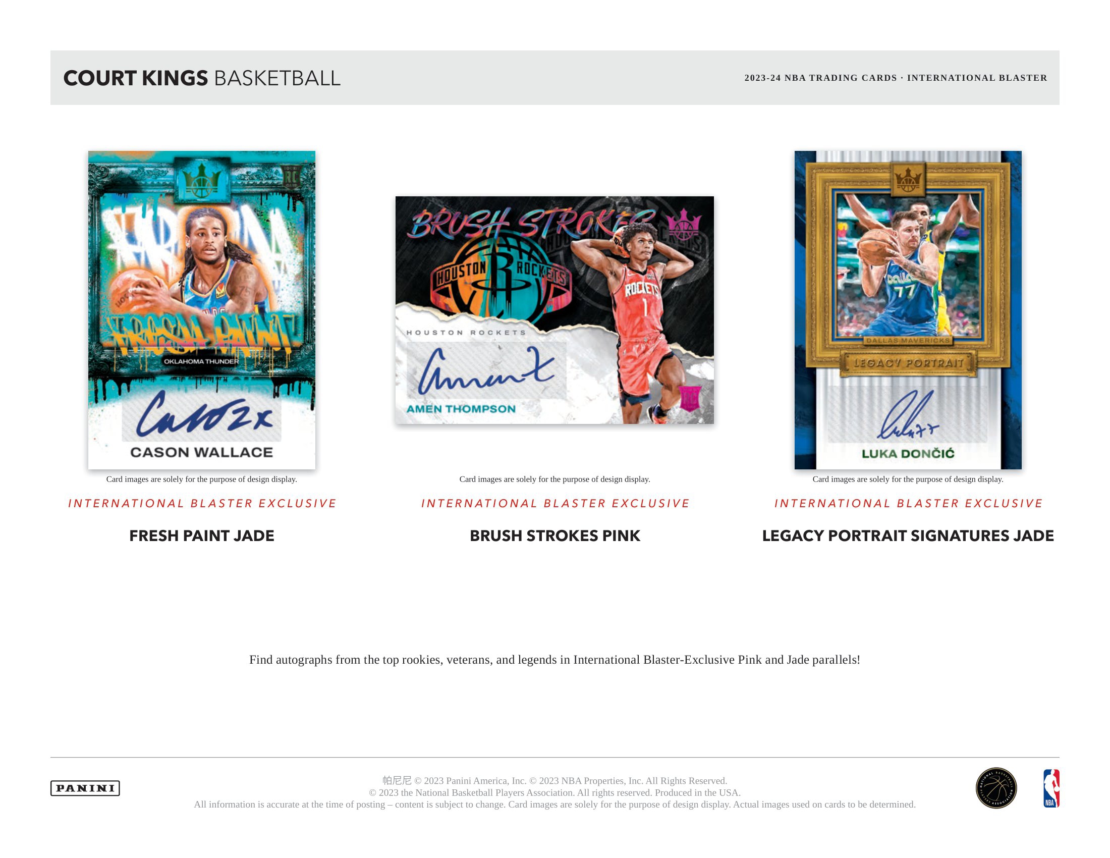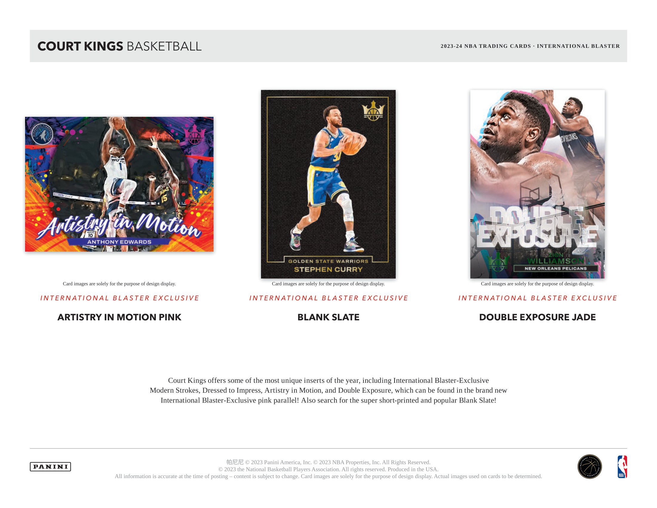 Court Kings offers some of the most unique inserts of the year, including International Blaster-Exclusive Modern Strokes, Dressed to Impress, Artistry in Motion, and Double Exposure, which can be found in the brand new International Blaster-Exclusive pink parallel! Also search for the super short-printed and popular Blank Slate!