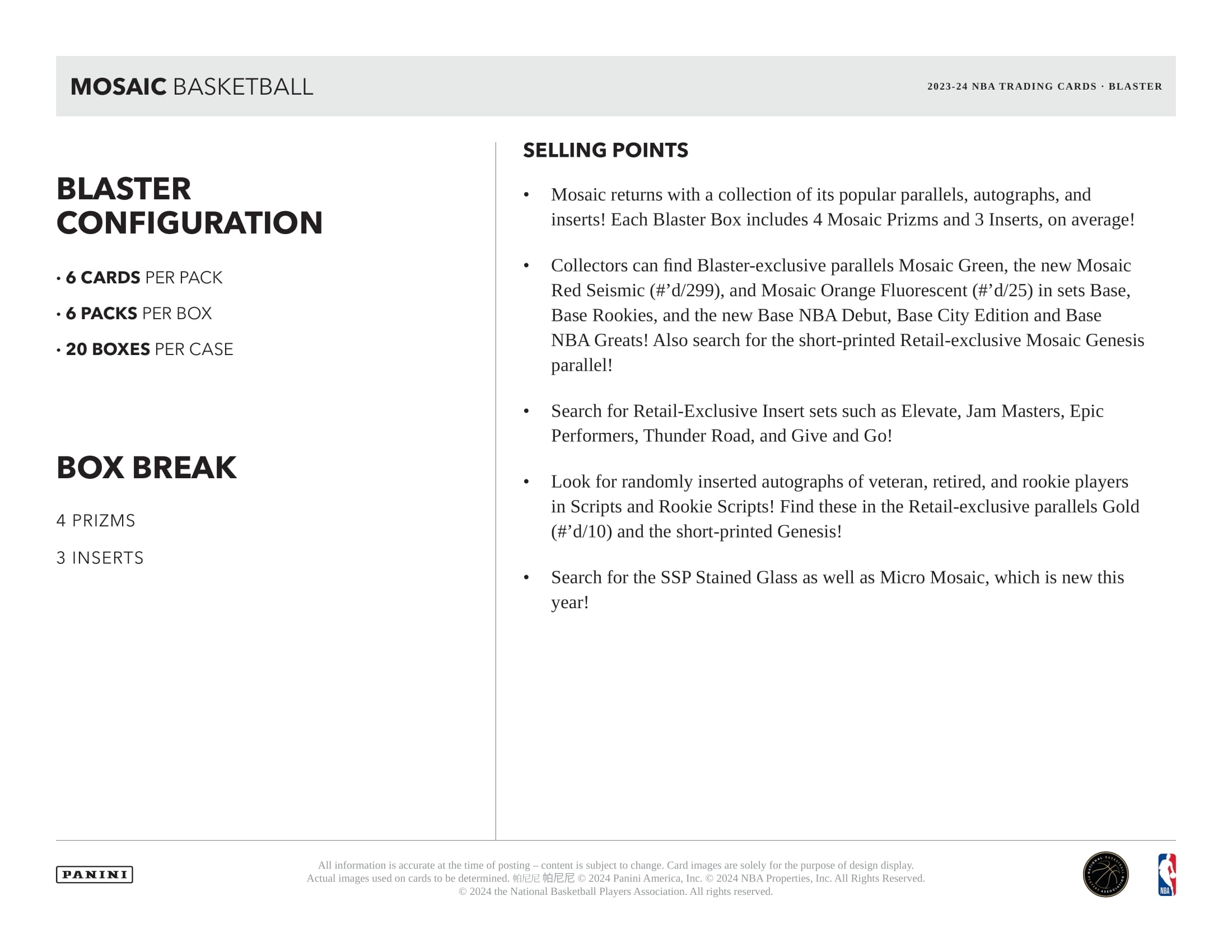2023-24 Panini Mosaic Basketball returns with a collection of its popular parallels, autographs, and inserts! Each Blaster Box includes 4 Mosaic Prizms and 3 Inserts, on average!