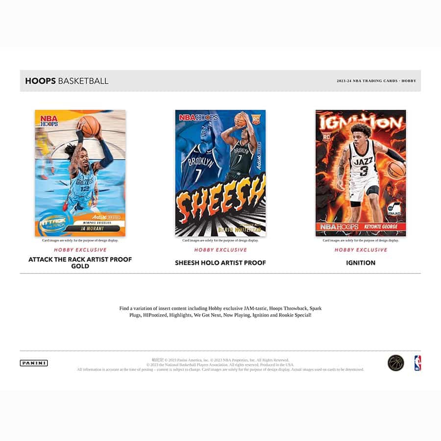 ATTACK THE RACK ARTIST PROOF / SHEESH HOLO ARTIST PROOF / IGNITION: Find a variation of insert content including Hobby-exclusive JAM-tastic, Hoops Throwback, Spark Plugs, HIPnotized, Highlights, We Got Next, Now Playing, Ignition and Rookie Special!