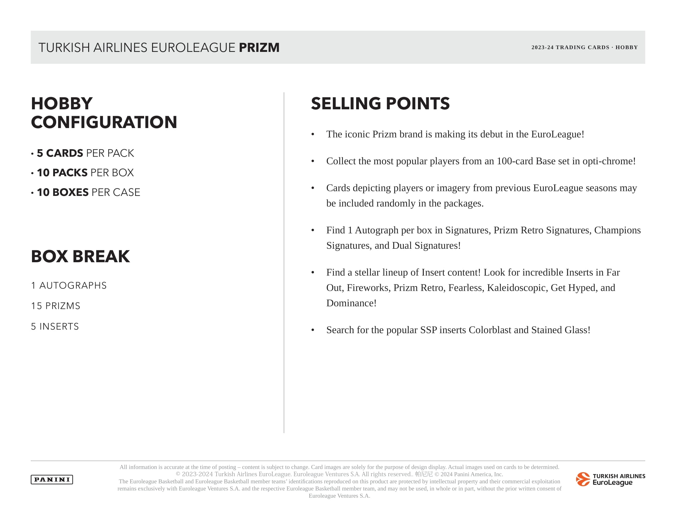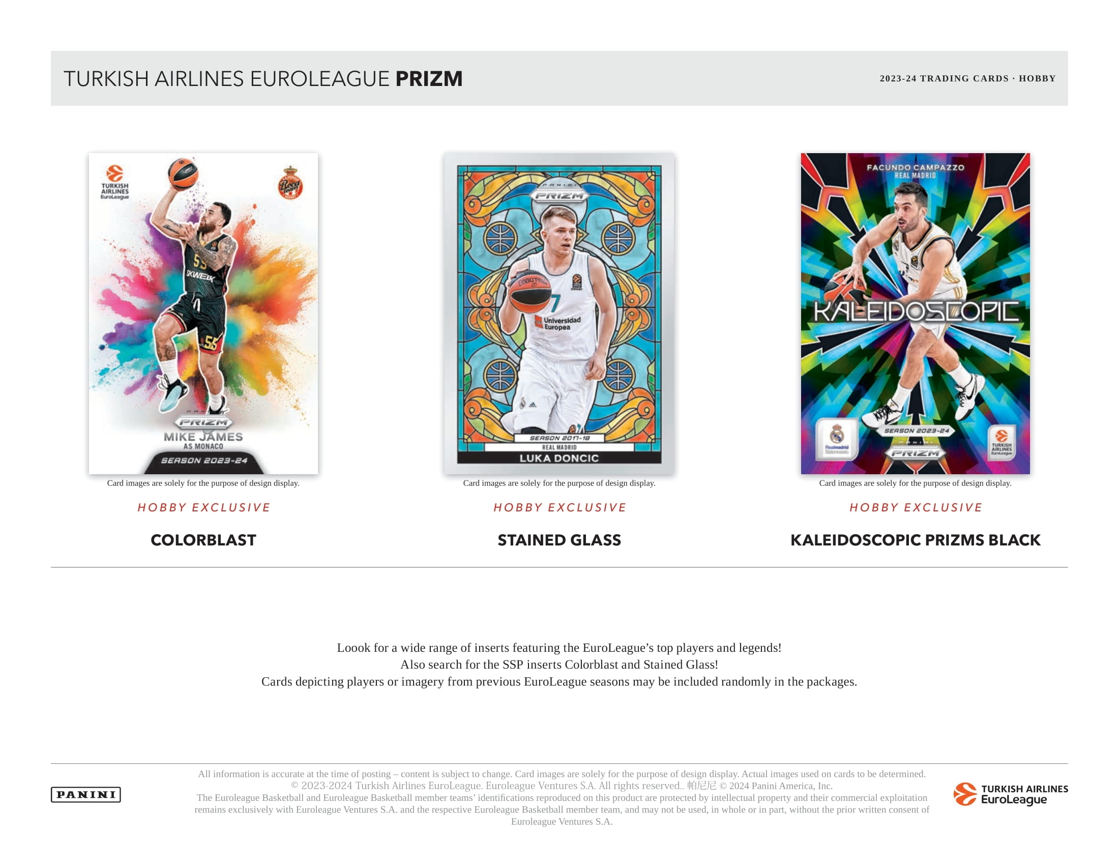 INSERTS: Look for a wide range of inserts featuring the EuroLeague's top players and legends! Also search for the SSP inserts Colorblast and Stained Glass!