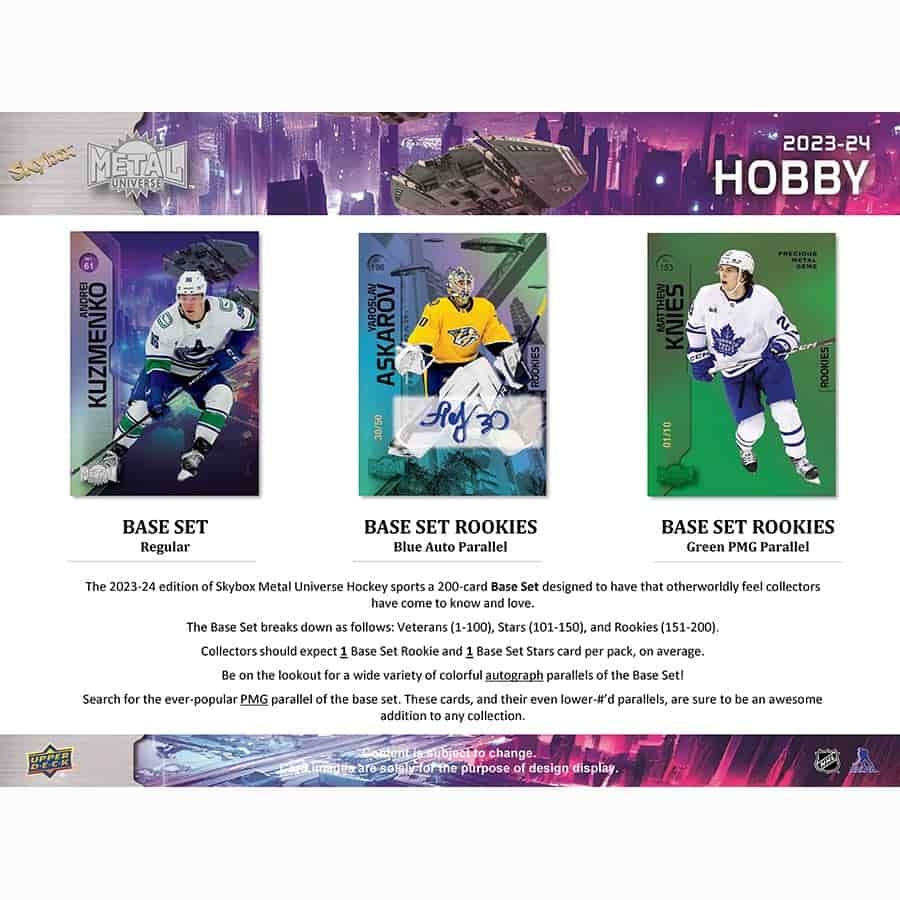 The 2023-24 edition of Skybox Metal Universe Hockey sports a 200-card Base Set designed to have that otherwordly feel collectors have come to know and love. The Base Set breaks down as follows: Veterans (1-100), Stars (101-150) and Rookies (151-200).