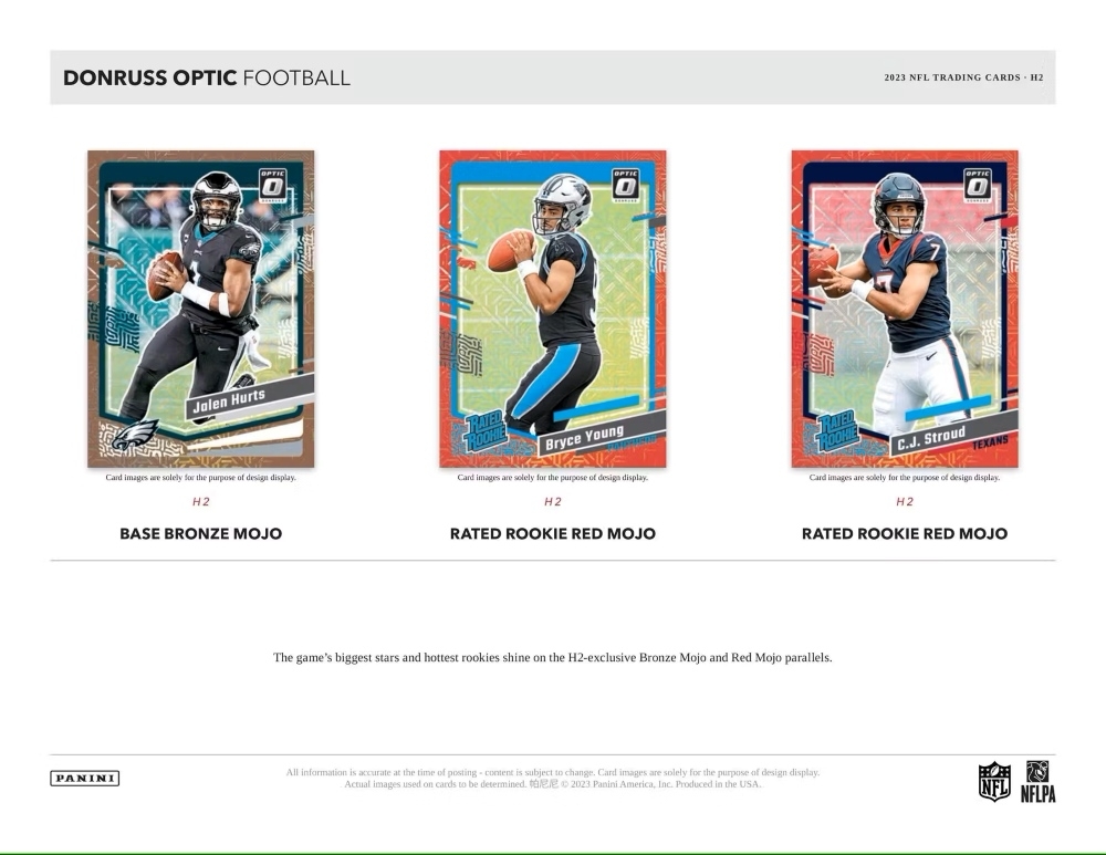 Every Box contains, on average: Twelve Rated Rookies, Five H2-Exclusive Parallels (Four Red Mojo & One Bronze Mojo), Five Inserts, One Base Silver & One Rated Rookie Silver!