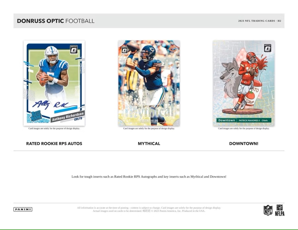 The flagship Donruss Football epically meets Optichrome technology with 2023 Donruss Optic Football, a dynamic product featuring Donruss' trademark bells and whistles such as Rated Rookies, Downtown! and more.