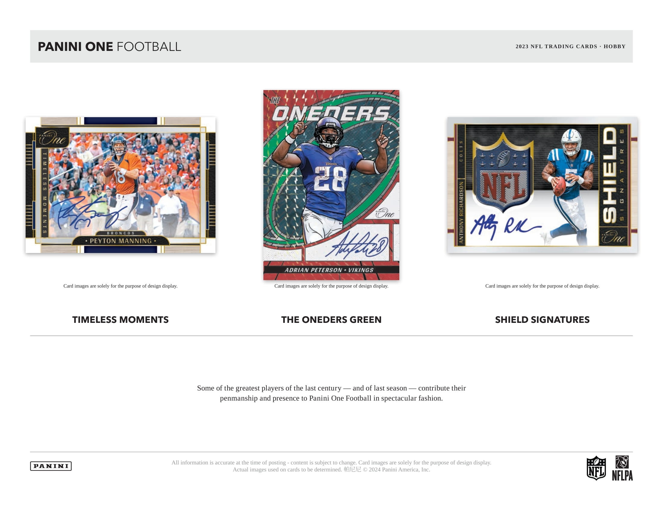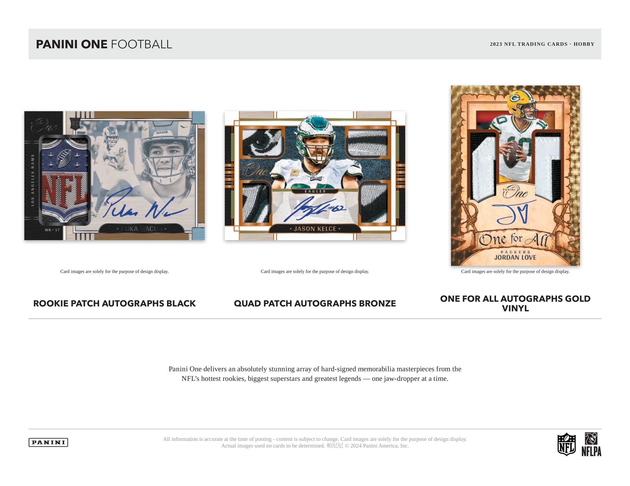 2023 Panini One Football delivers an absolutely stunning array of hard-signed memorabilia masterpieces from the NFL's hottest rookies, biggest superstars and greatest legends - one jaw-dropper at a time.