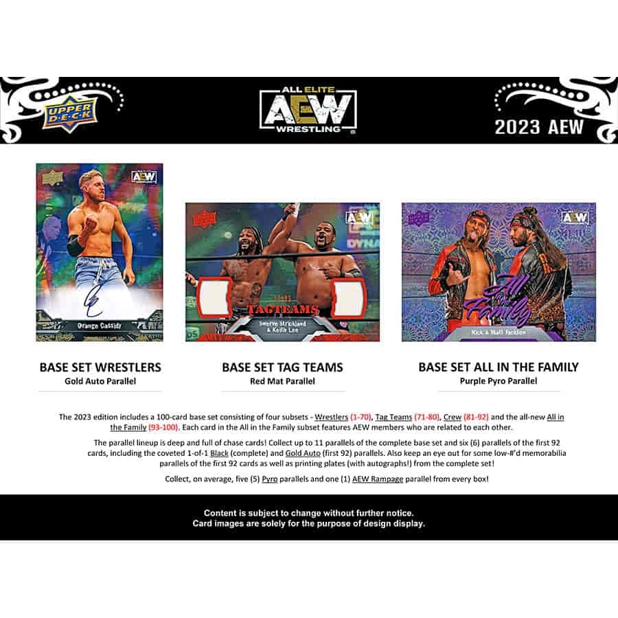 The 2023 edition includes a 100-card base set consisting of four subsets - Wrestlers (1-70), Tag Teams (71-80), Crew (81-92) and the all-new All in the Family (93-100). Each card in the All in the Family subset features AEW members who are related to each other.