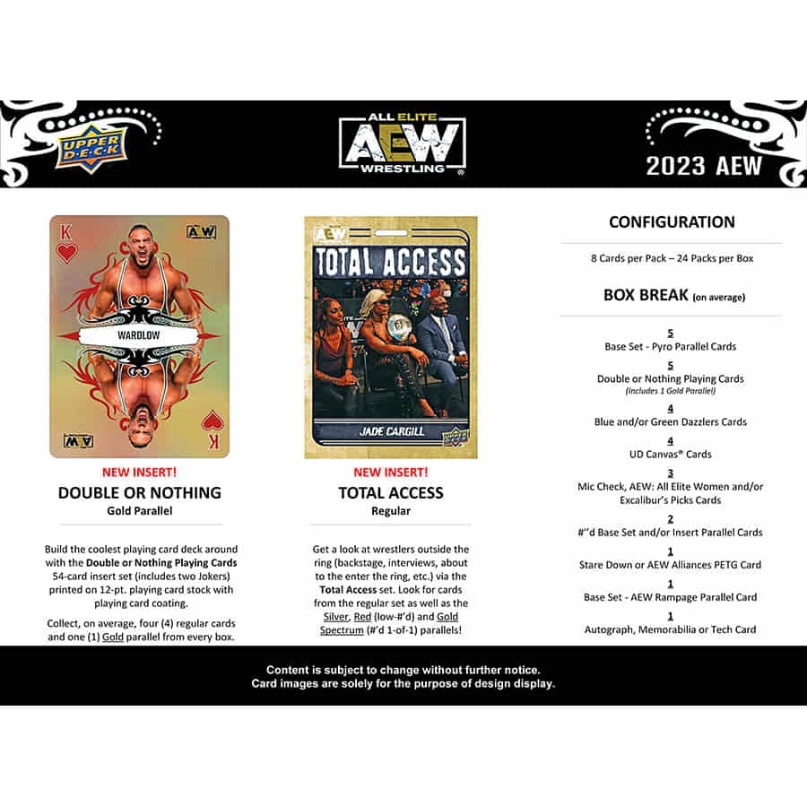 Every Box contains Five Base Set Pyro Parallel Cards, Five Double or Nothing Playing Cards, Four Blue/Green Dazzlers Cards, Four UD Canvas Cards, Three Mic Check, AEW: All Elite Women and/or Excalibur's Picks Cards, Two #'d Base Set/Insert Parallel Cards, One Stare Down/AEW Alliances PETG Card, One Base Set AEW Rampage Parallel Card & One Autograph/Memorabilia/Tech Card, on average !