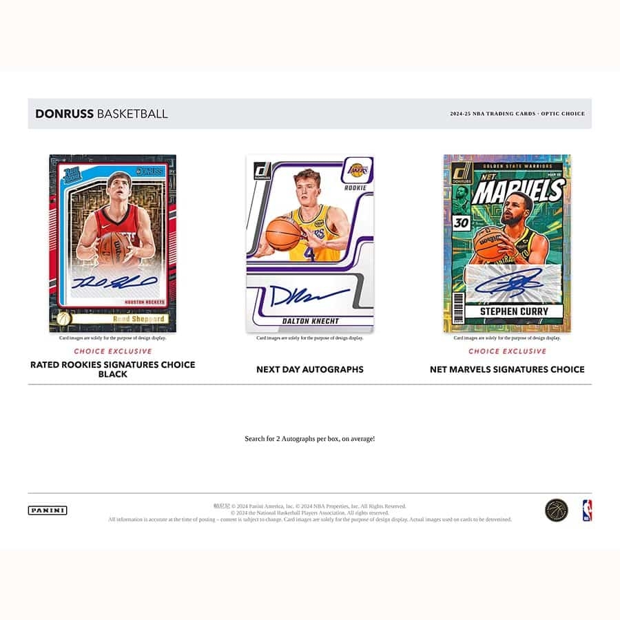 Find 2 autographs per box, on average! Look for Dominators Autographs, Rated Rookies Signatures, and the all-new Net Marvels Signatures in Choice-Exclusive parallels! Also, chase the popular Next Day Autographs.