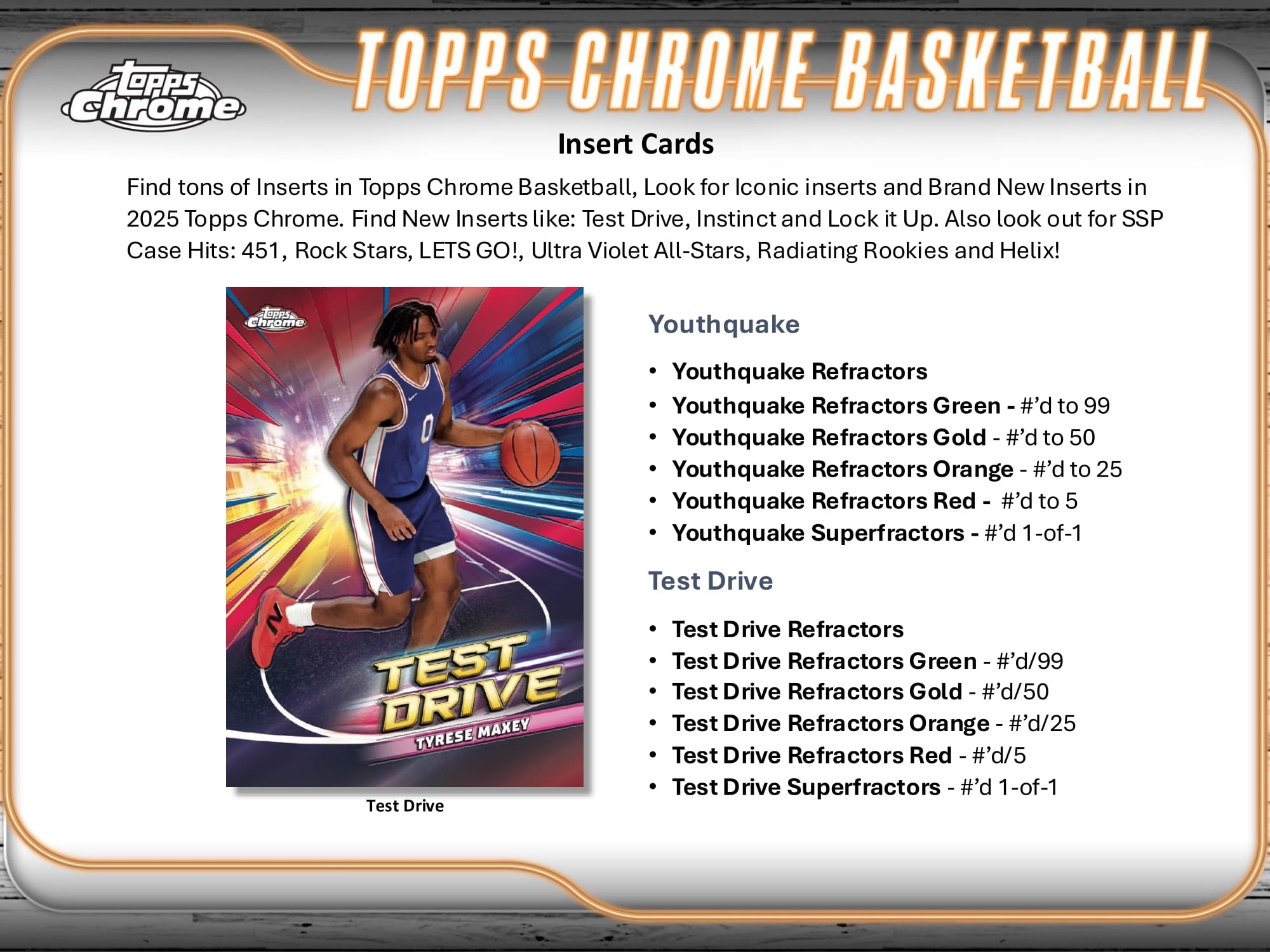 Collectors can look forward to an exciting mix of refractor parallels and autographs, along with a wide range of new inserts like Test Drive, Instinct, and Lock it Up. Plus, keep an eye out for major SSP Case Hits including 451, Rock Stars, LETS GO!, Ultra Violet All-Stars, Radiating Rookies, and Helix!
