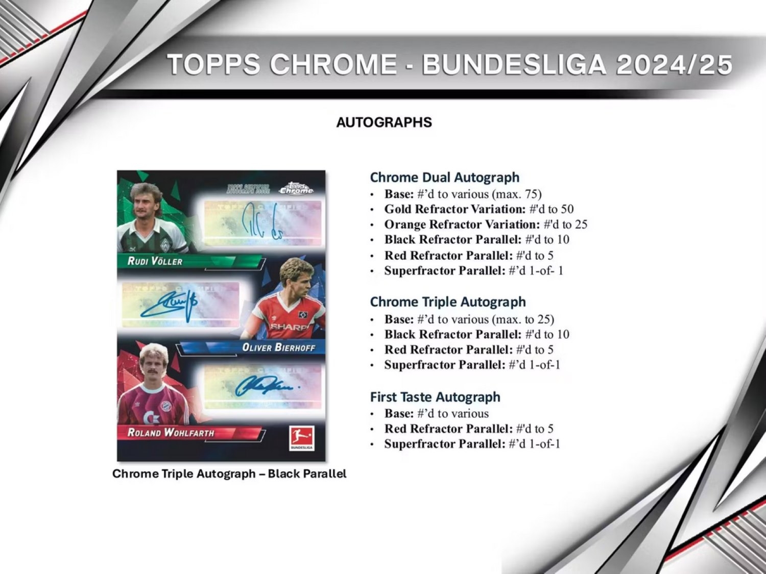 Topps Chrome returns to the Bundesliga in top form with the 2024/25 Topps Chrome Bundesliga Hobby Box! This premium release celebrates another exciting season of German football with an impressive lineup of rookies, stars, and legends - wrapped in sleek Chrome design and bursting with parallels, inserts, and stunning autograph content.
