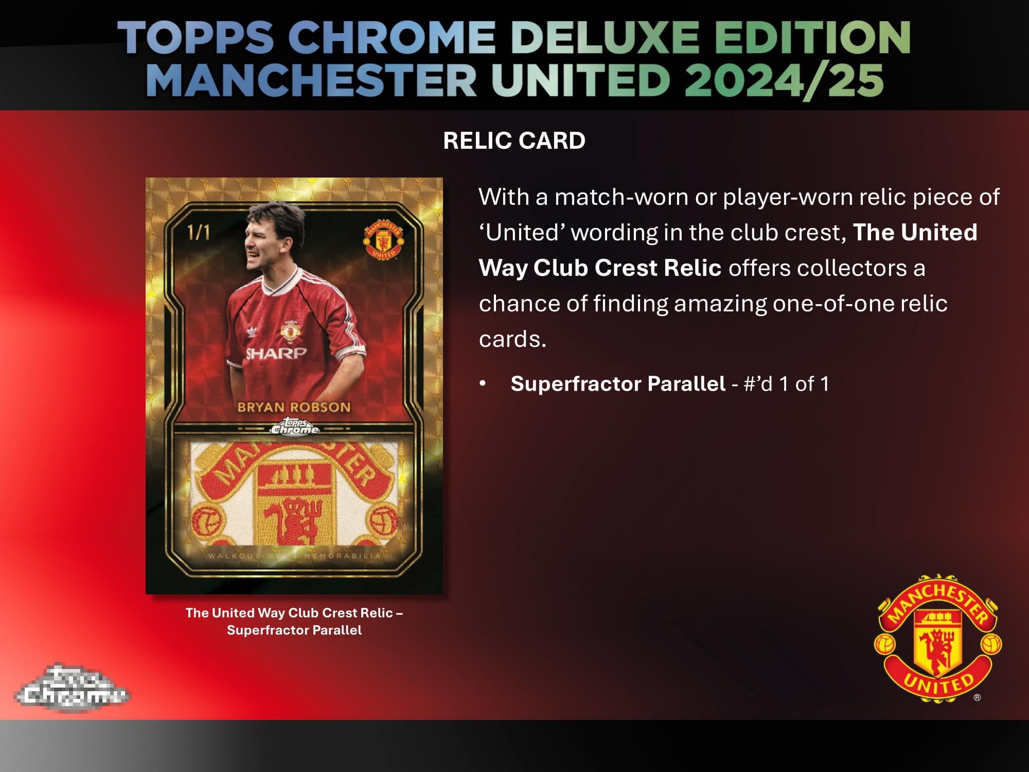 Topps proudly presents the 2024/25 Topps Chrome Deluxe Edition Manchester United, an exclusive chrome trading card collection celebrating the legacy of one of the most iconic football clubs in the world. Featuring a mix of legendary players, current stars, and emerging talents, this deluxe release offers collectors a premium experience.
