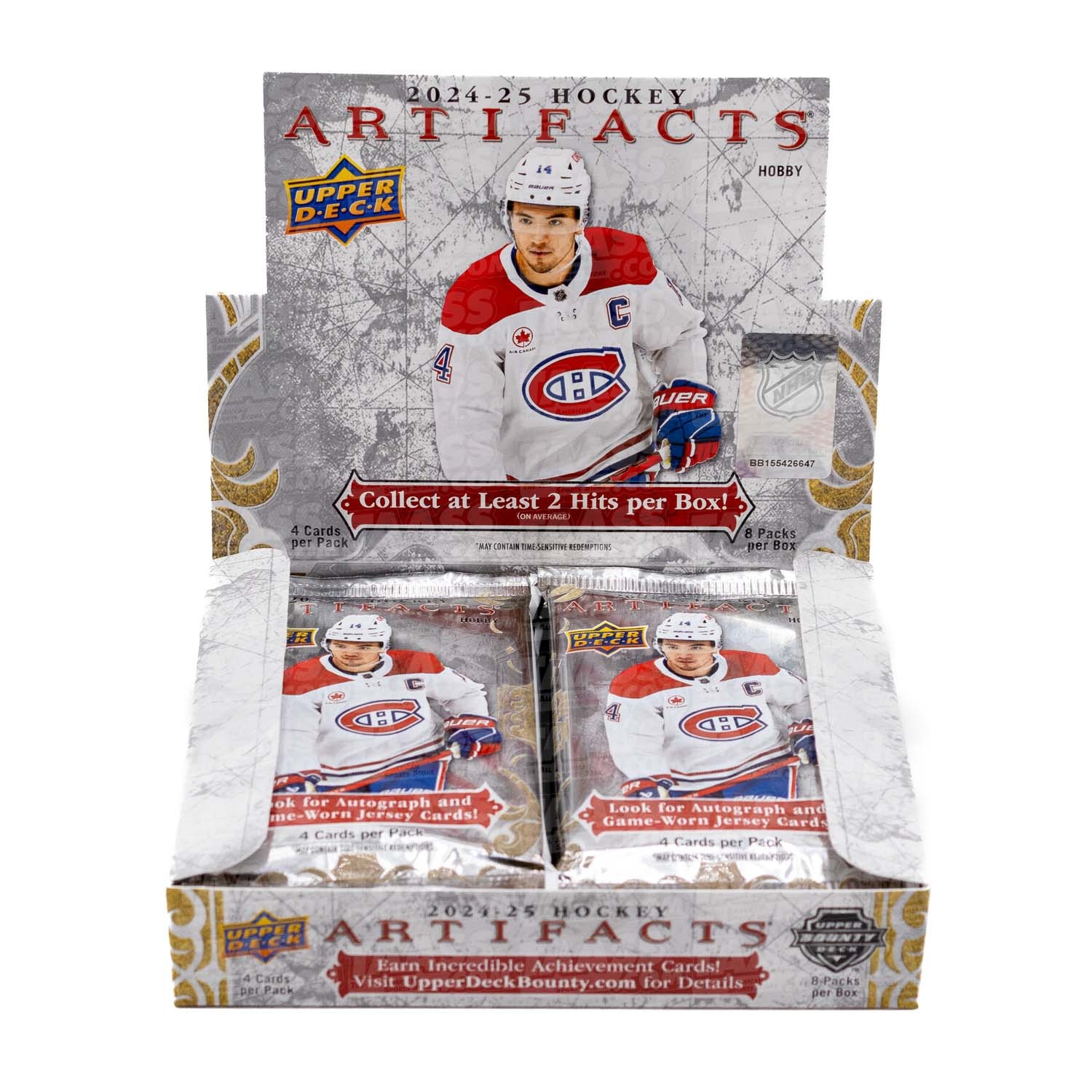 The 2024-25 Upper Deck Artifacts Hockey Hobby Box returns, offering a captivating collection of NHL cards for fans and collectors! This series features a robust 250-card base set, including redemption cards for the 2024-25 rookie class, complemented by stunning parallels, memorabilia, and autographs.
