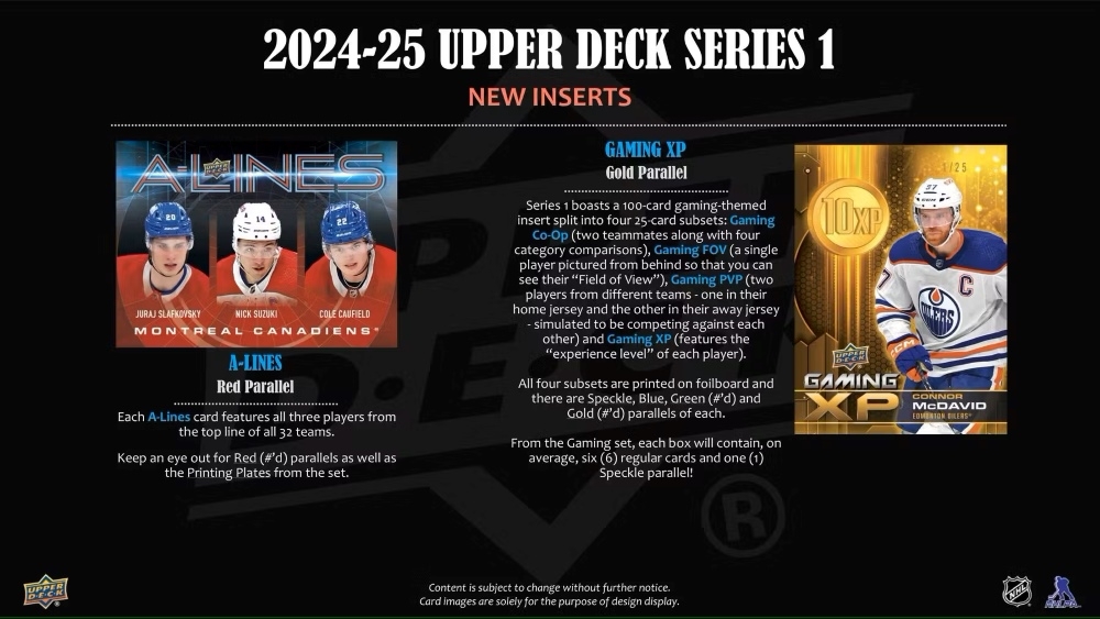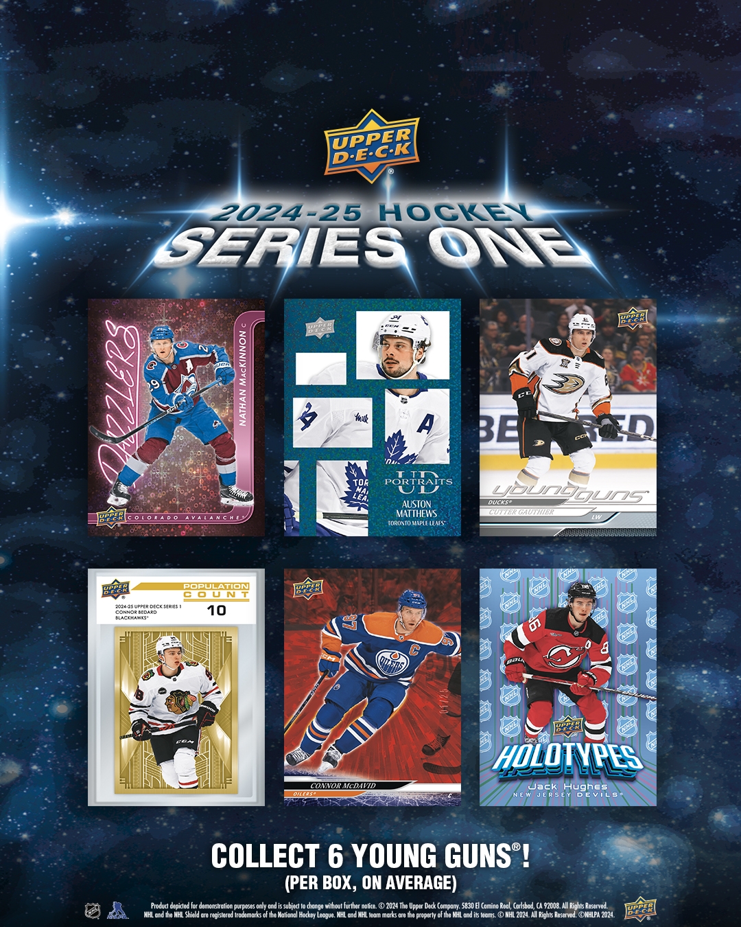 Series 1 sports the first 250 cards of the 2024-25 Upper Deck Base Set. Annually, the Upper Deck Base Set is the most widely-collected Base Set in hockey. It includes 198 Veteran cards, 49 Young Guns rookie cards and three checklist cards. The iconic Young Guns are the most anticipated rookie cards of the season.