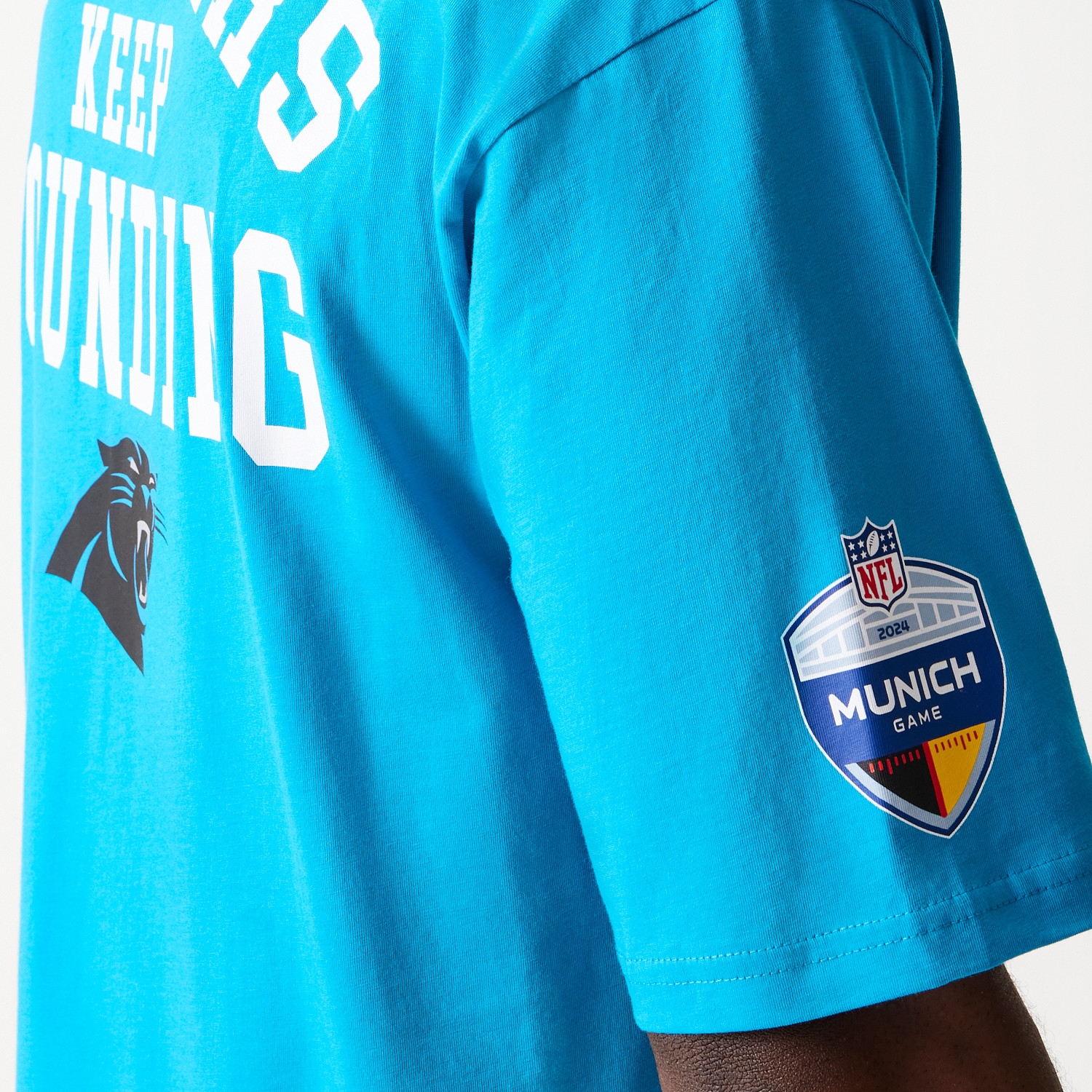 Get the official New Era American Football Men's T-Shirt of the Carolina Panthers, exclusively designed for the 2024 NFL season game in Munich! This blue oversized T-shirt, featuring the iconic "Keep Pounding" slogan, is perfect for supporting your team in the thrilling showdown against the New York Giants.