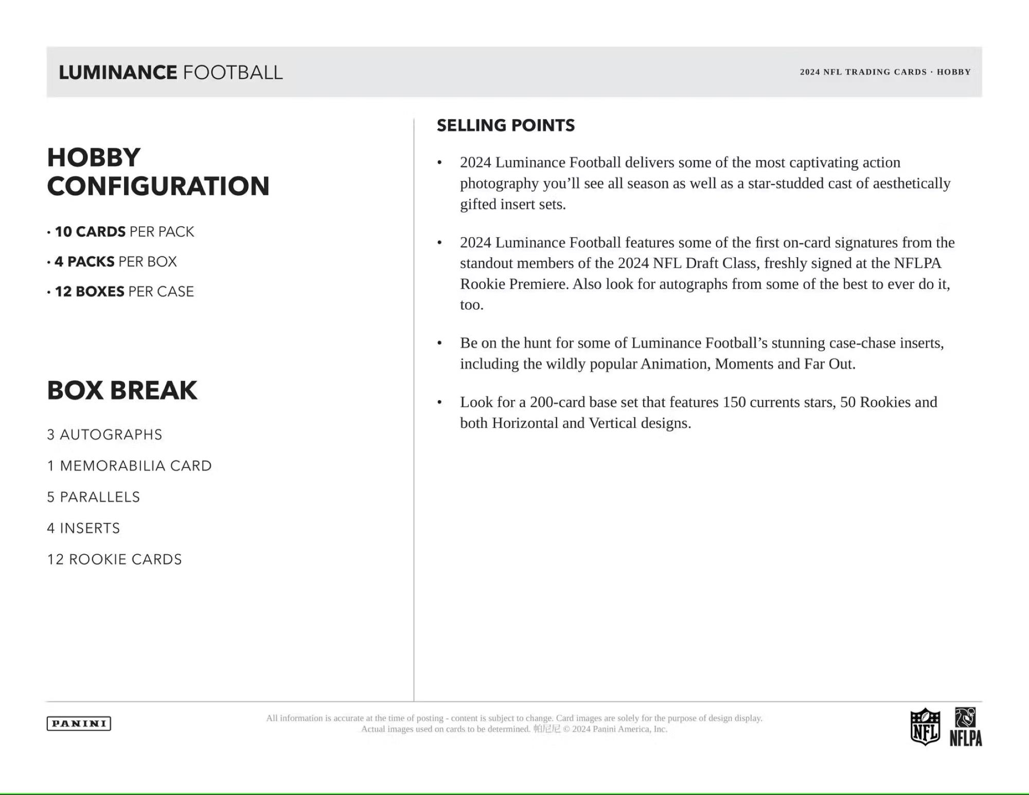 YEAR ONE SIGNATURES / YEAR ONE DUAL SIGNATURES / PORTRAIT SIGNATURES: 2024 Luminance Football features some of the first on-card signatures from the standout members of the 2024 NFL Draft Class, freshly signed at the NFLPA Rookie Premiere. Also look for autographs from some of the best to ever do it, too.
