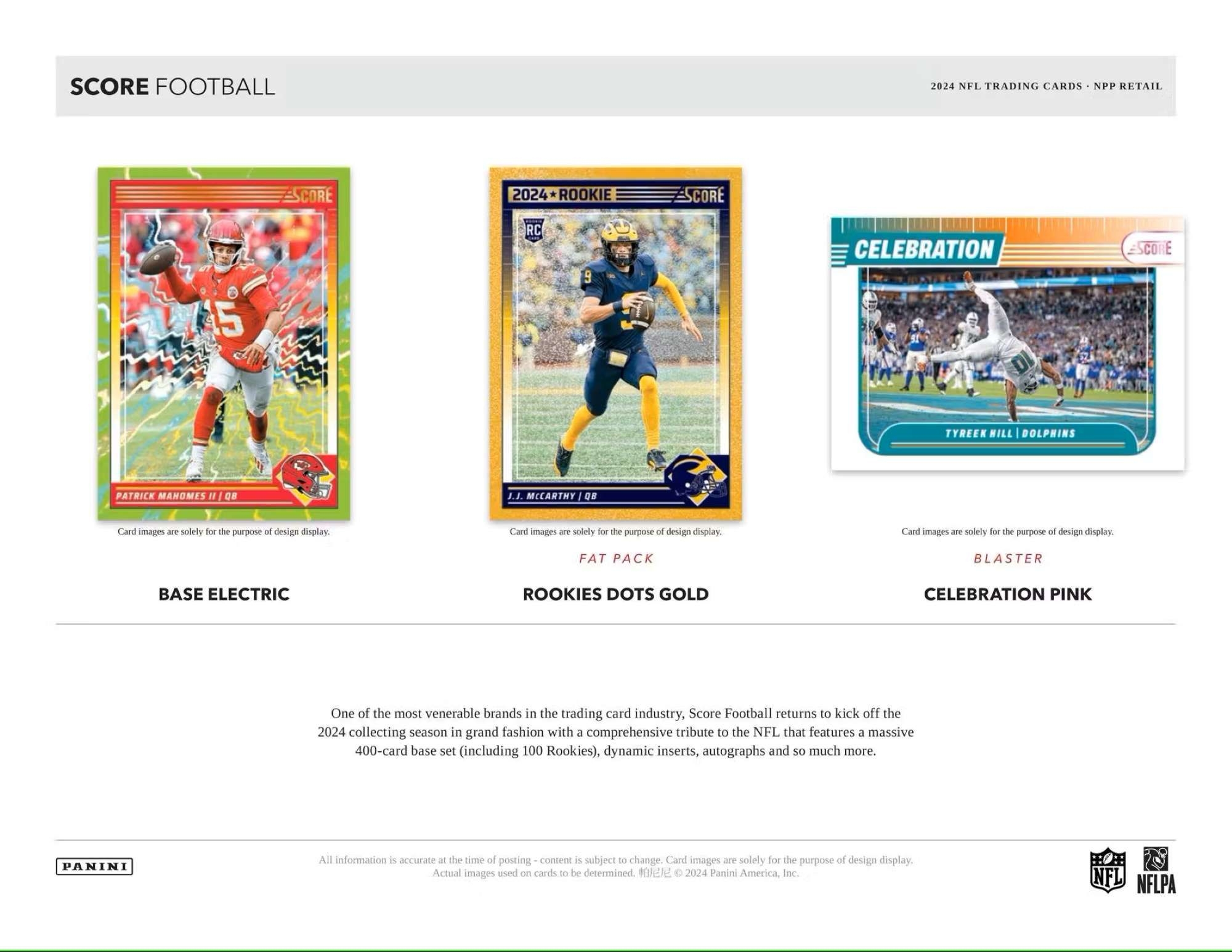 One of the most venerable brands in the trading card industry, Score Football returns to kick off the 2024 collecting season in grand fashion with a comprehensive tribute to the NFL that features a massive 400-card base set (including 100 Rookies), dynamic inserts, autographs and so much more.