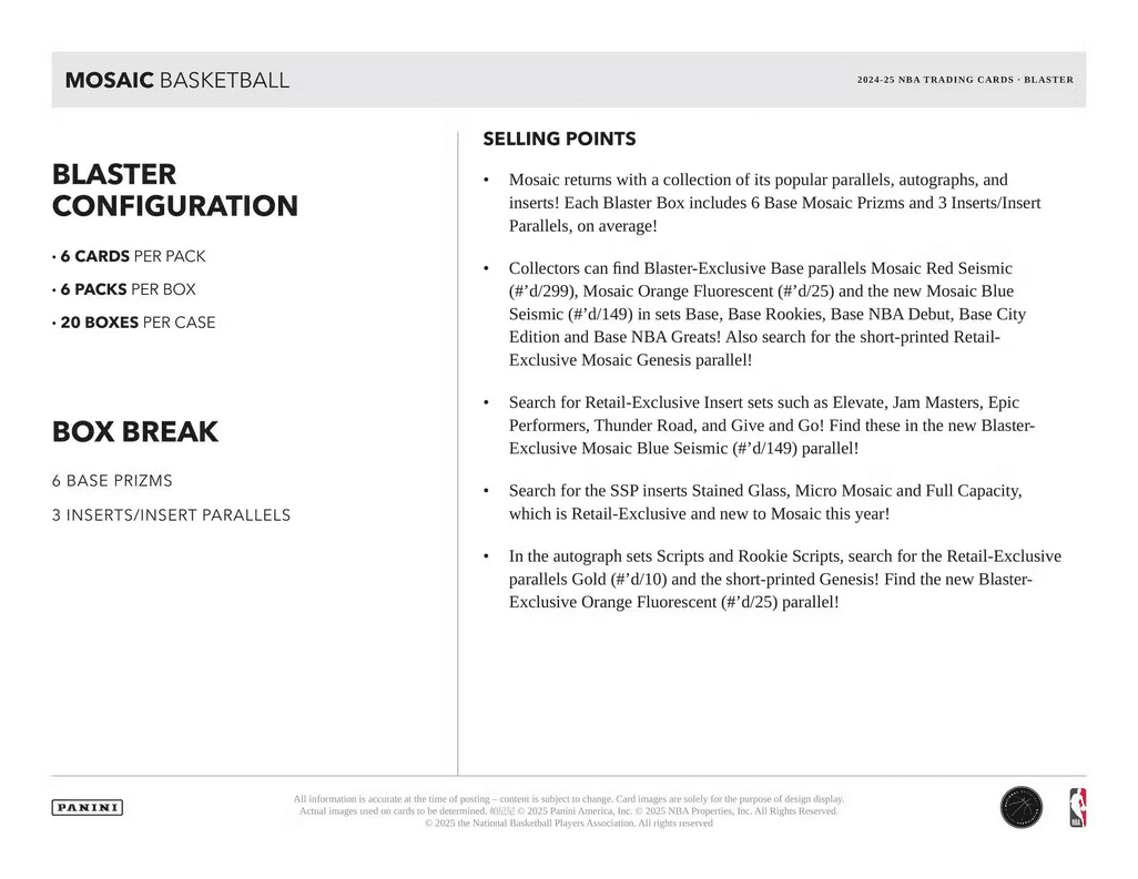 Mosaic is back with a stunning lineup of its popular parallels, autographs, and inserts! Each Blaster Box delivers, on average, 6 Base Mosaic Prizms and 3 Inserts or Insert Parallels - perfect for collectors looking to rip into the new season!