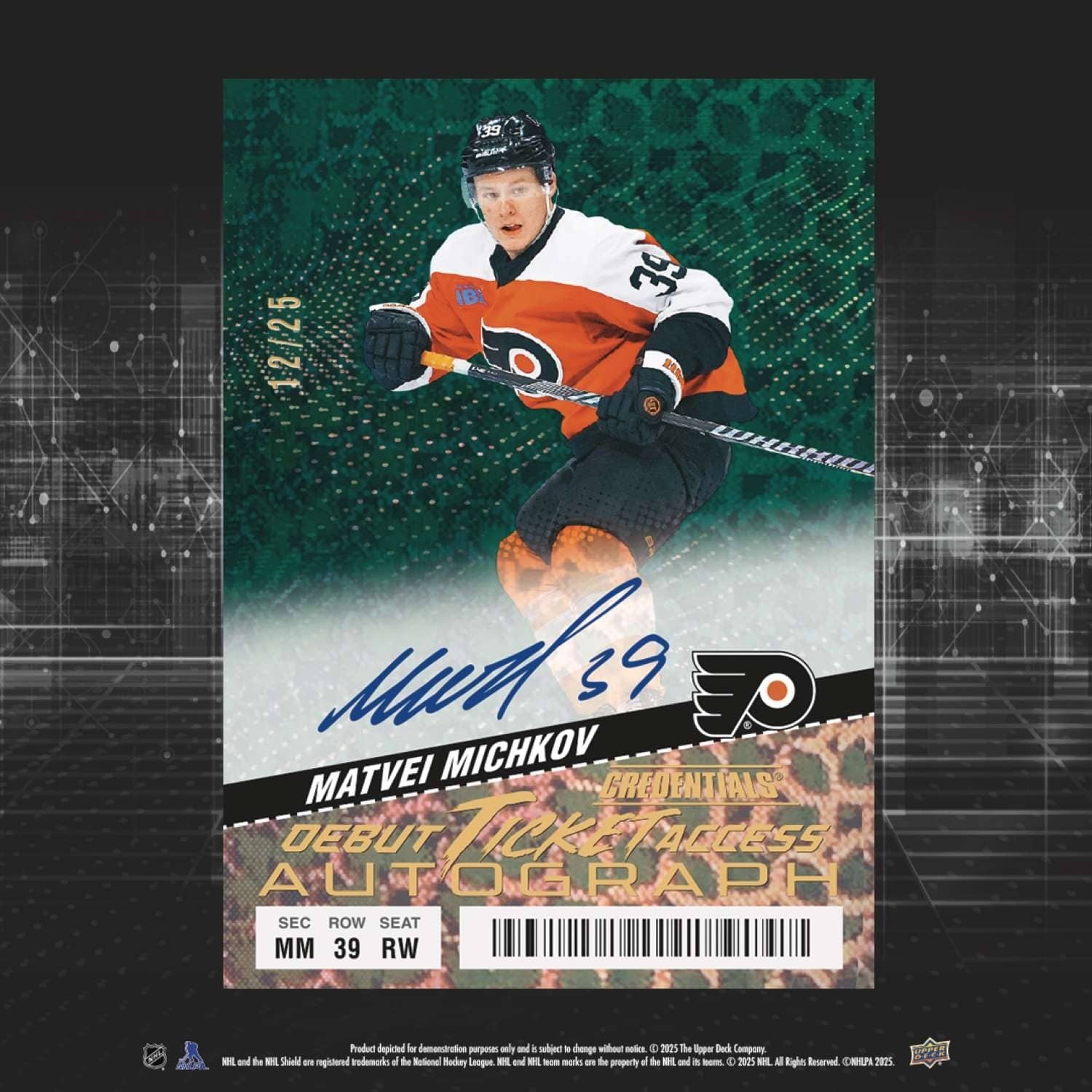 The fan-favorite Credentials Hockey returns for the 2024-25 season, packed with exciting inserts, stunning parallels, hard-signed autographs, and some of the year's hottest NHL rookies! The 150-card base set includes 100 veteran cards and 50 Debut Ticket Access rookie cards - each featured in both vertical (#/999) and horizontal formats with multiple parallels to chase.