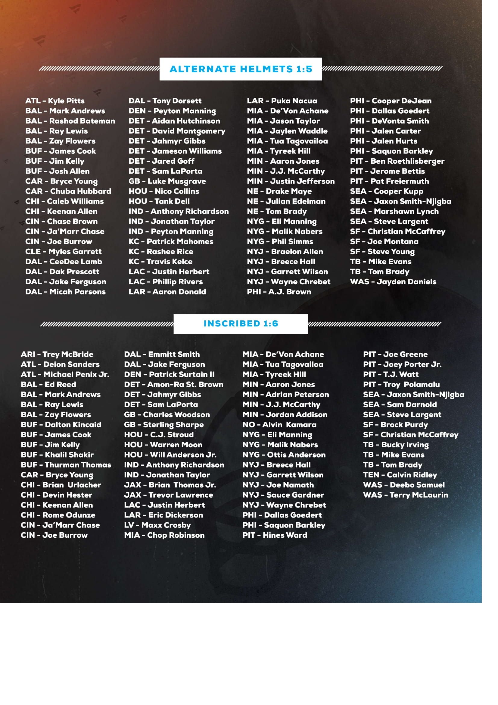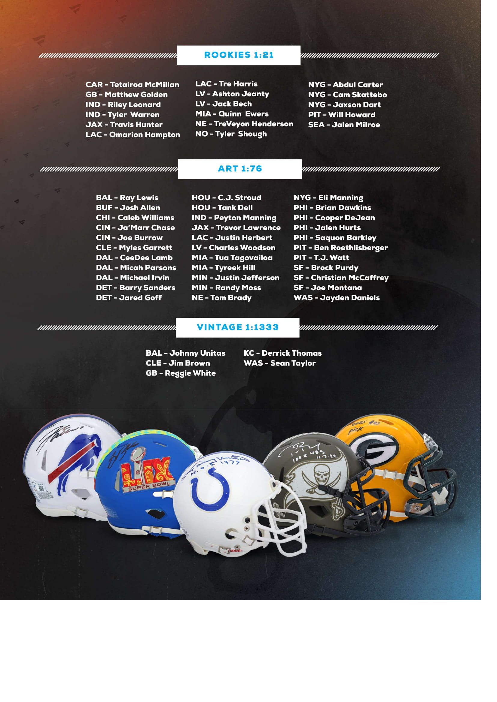 Under Wraps NFL Mini-Helmets feature six categories: Single-Signed 1:2, Alternate Helmets 1:5; Inscribed 1:6, Rookies 1:21, Art 1:76, Vintage 1:1333 - check the checklist as photos !