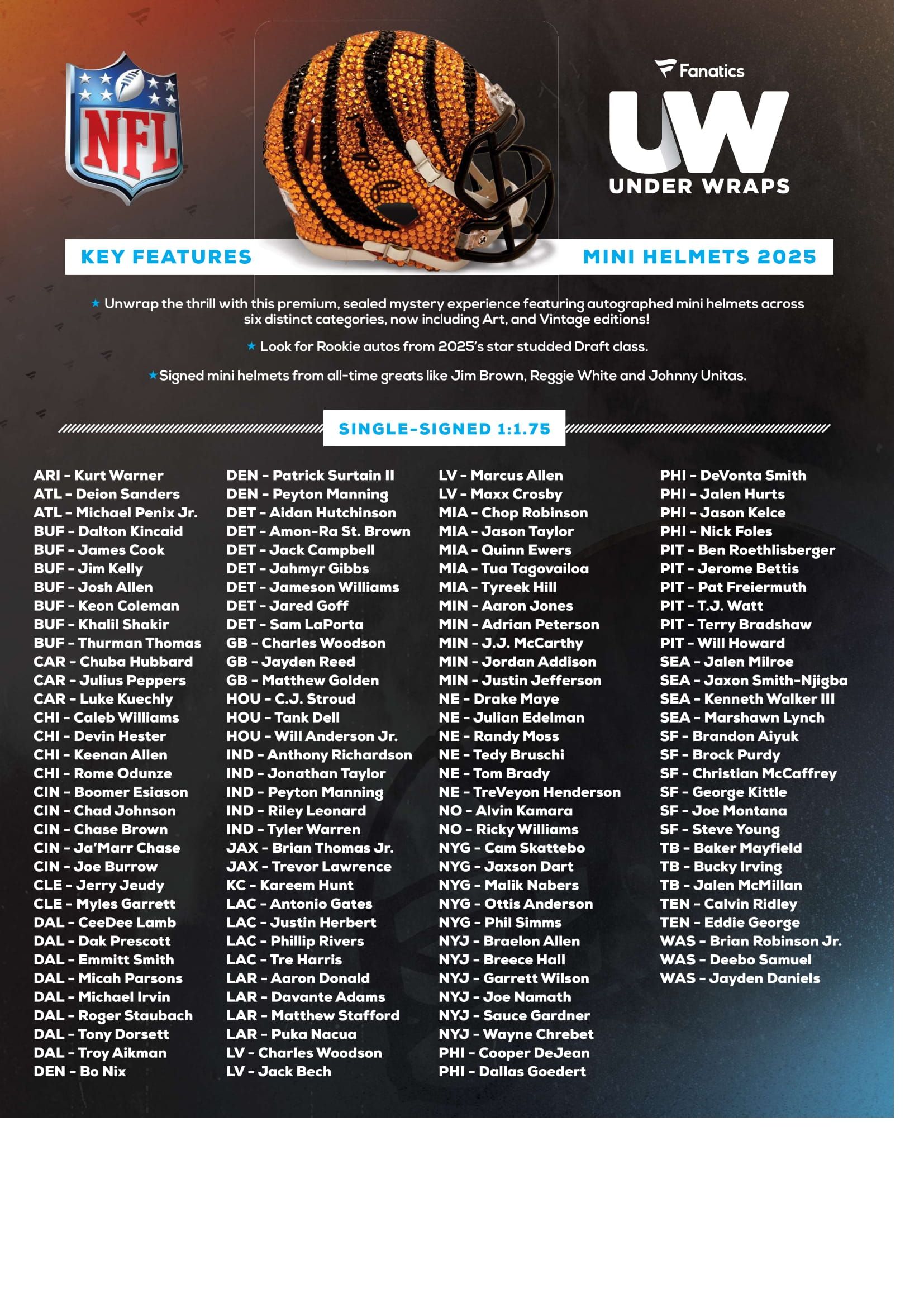 Under Wraps returns in 2025 with an exciting new Mini Helmet series - perfect for collectors who want to add a small but powerful piece of their favorite NFL teams. These mystery mini helmets are full of surprises: signed, limited, and ideal for your next live break or as a standout display piece.