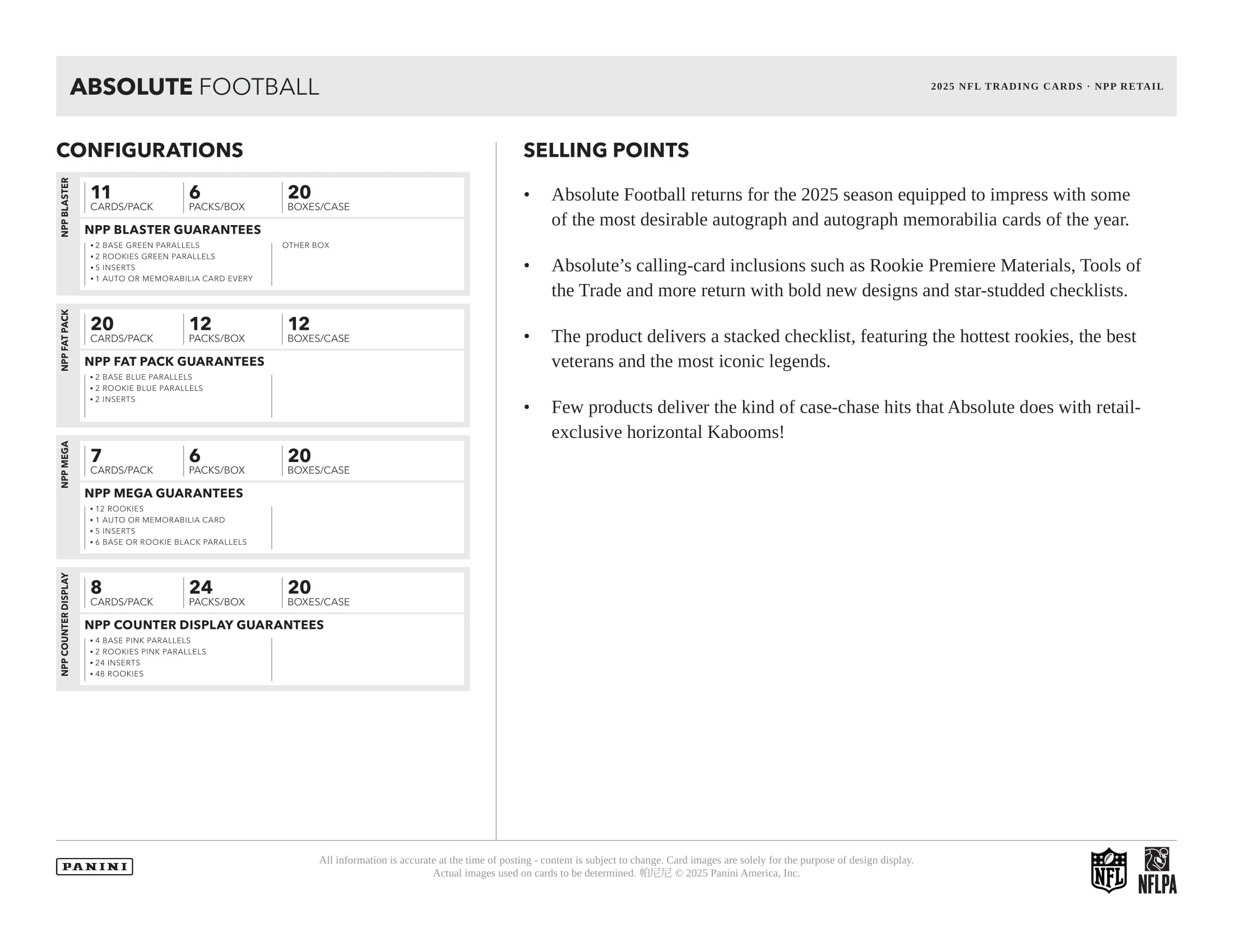 Absolute Football offers an impressive combination of rookie potential, veteran consistency, and legendary names. Combined with fan-favorite autograph and memorabilia formats, plus bold annual design updates, it remains one of the top retail products of the season.