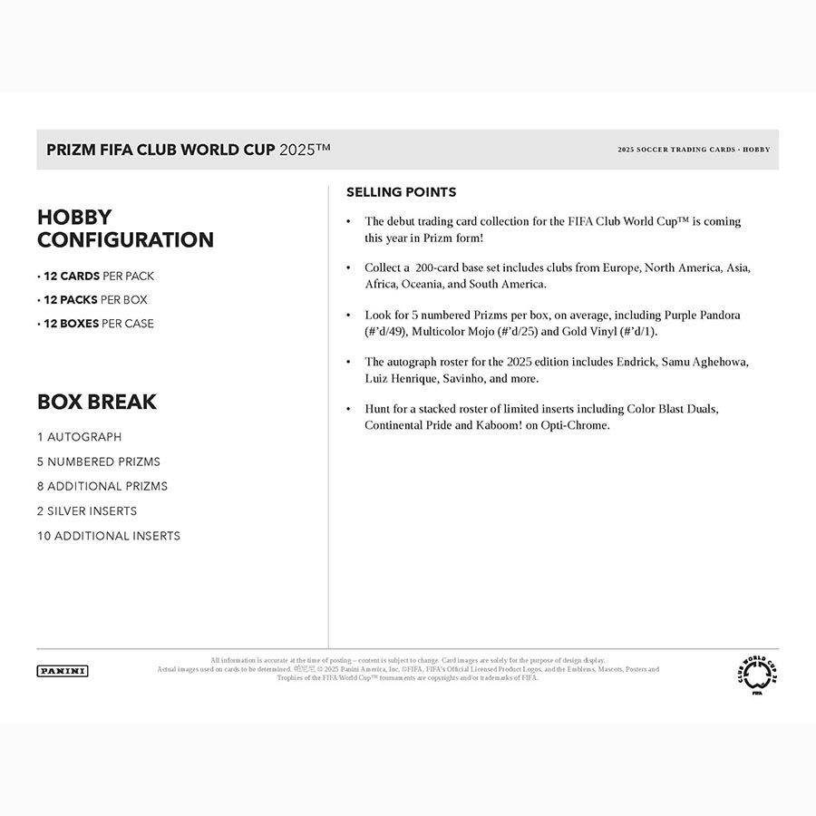 Panini brings the Club World Cup to life with the first-ever Prizm FIFA Club World Cup trading card collection! Packed with color, autographs, and the signature Prizm shine, this product highlights the biggest clubs across all continents - making it a must-have for soccer collectors and fans worldwide.