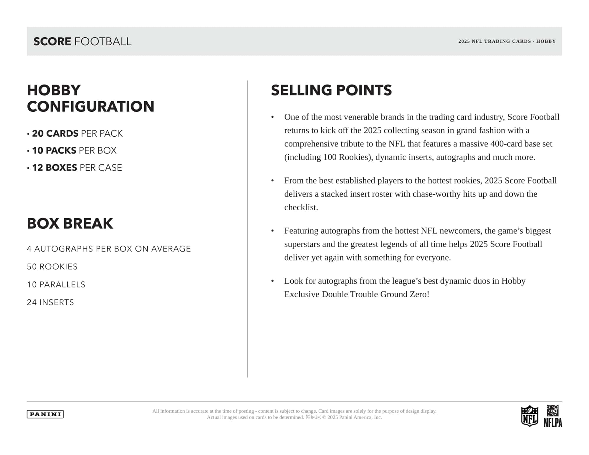 One of the most iconic brands in the trading card world returns in style: 2025 Score Football is here to open the new collecting season with a bang! Featuring a massive 400-card base set made up of 300 veterans and 100 rookies, Score delivers the ultimate NFL season kickoff.