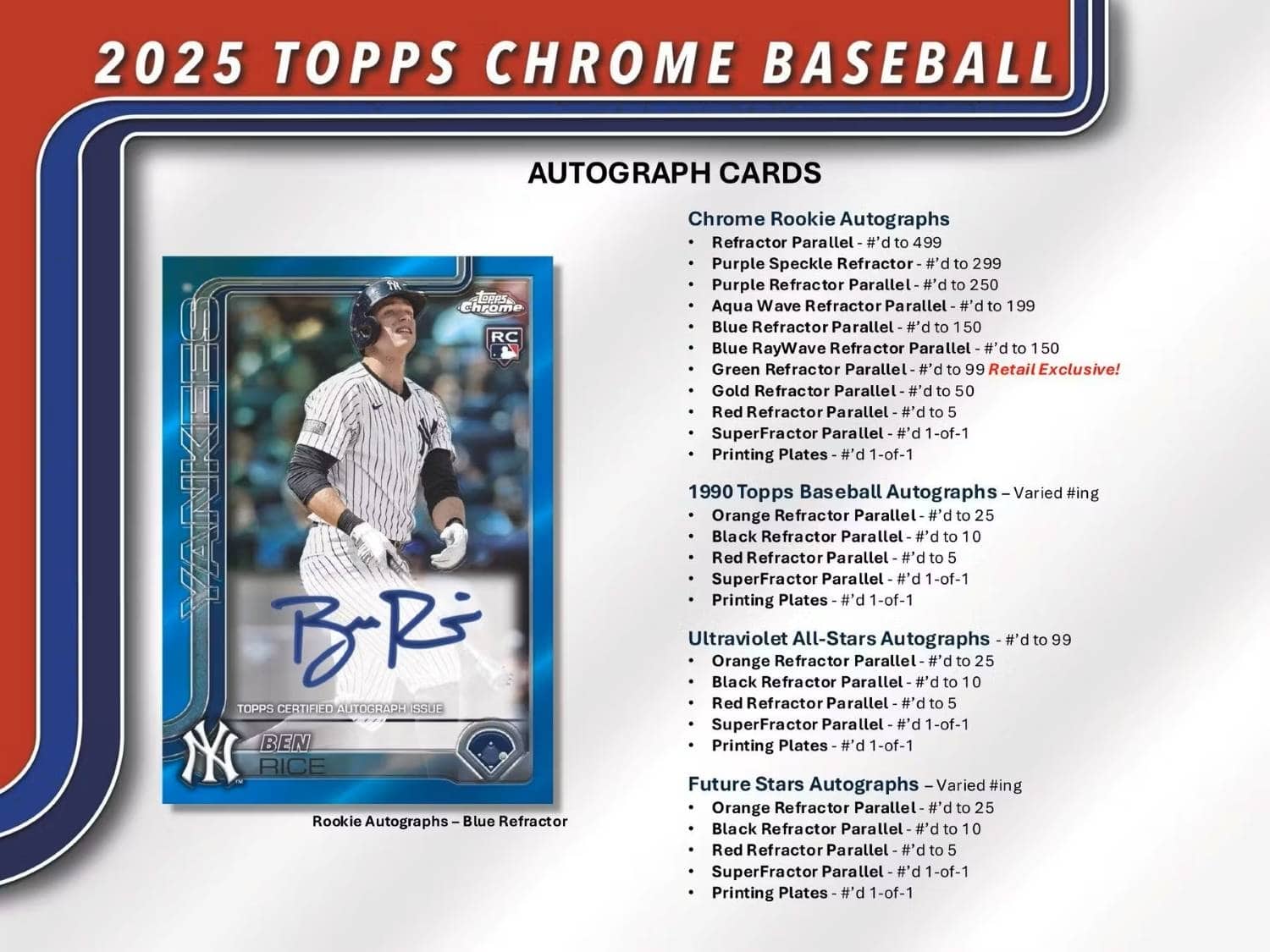 Look for Chrome Rookie Autographs from the top 2025 MLB Rookies including Jacob Wilson, Dylan Crews, James Wood, Hyeseong Kim, Matt Shaw, Roki Sasaki, Kristian Campbell, Coby Mayo, Thomas Saggese, Luisangel Acuna, Kumar Rocker, Nick Sogard, Trey Sweeney, Hurston Waldrep, Will Warren, Daniel Schneemann, Orelvis Martinez, Kameron Misner, Ben Rice, Rhett Lowder, Angel Martinez, Kevin Alcantara, Connor Norby, Spencer Schwellenbach, Jace Jung, Brooks Lee, Jackson Jobe, Adael Amador, Drew Thorpe, Jhonkensy Noel and many more !