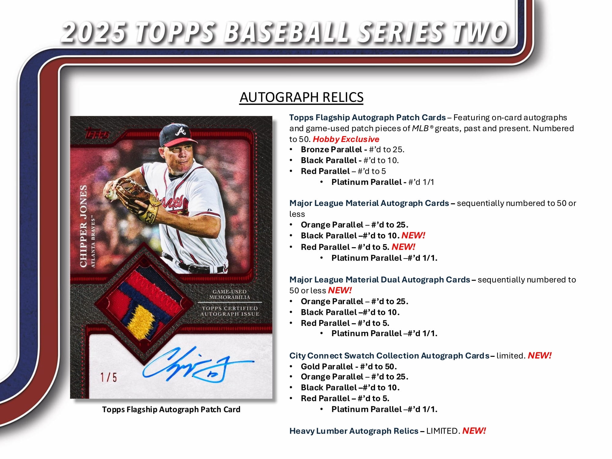 With the MLB season in full swing, 2025 Topps Baseball Series 2 delivers the second installment of Topps' iconic flagship set - featuring today's superstars, legendary players, and rising rookies across base cards, inserts, and hit content.