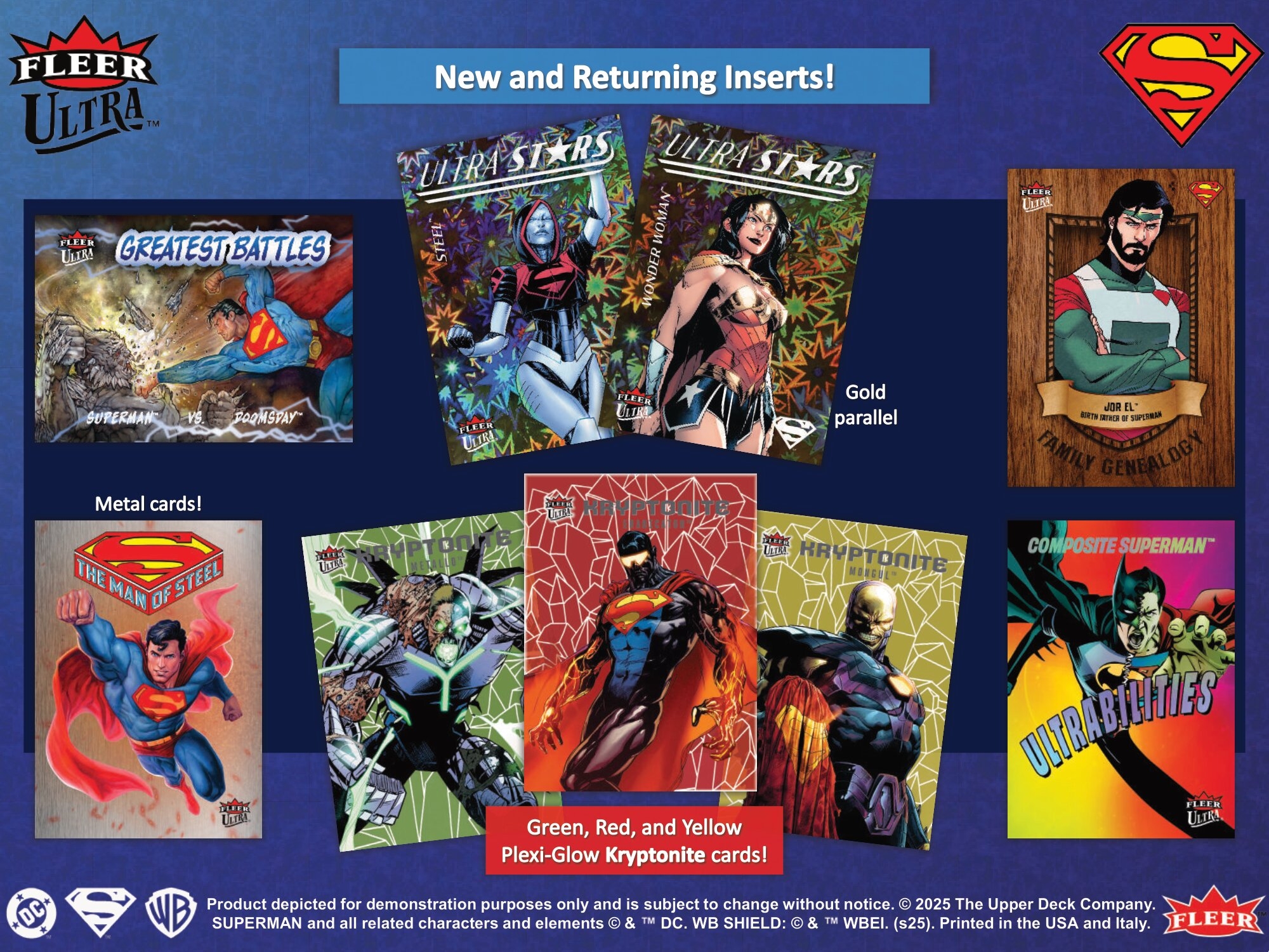 Fleer Ultra Superman takes flight with all-new original artwork, premium designs, and a wide range of inserts, parallels, and rare chase cards centered around the Man of Steel.