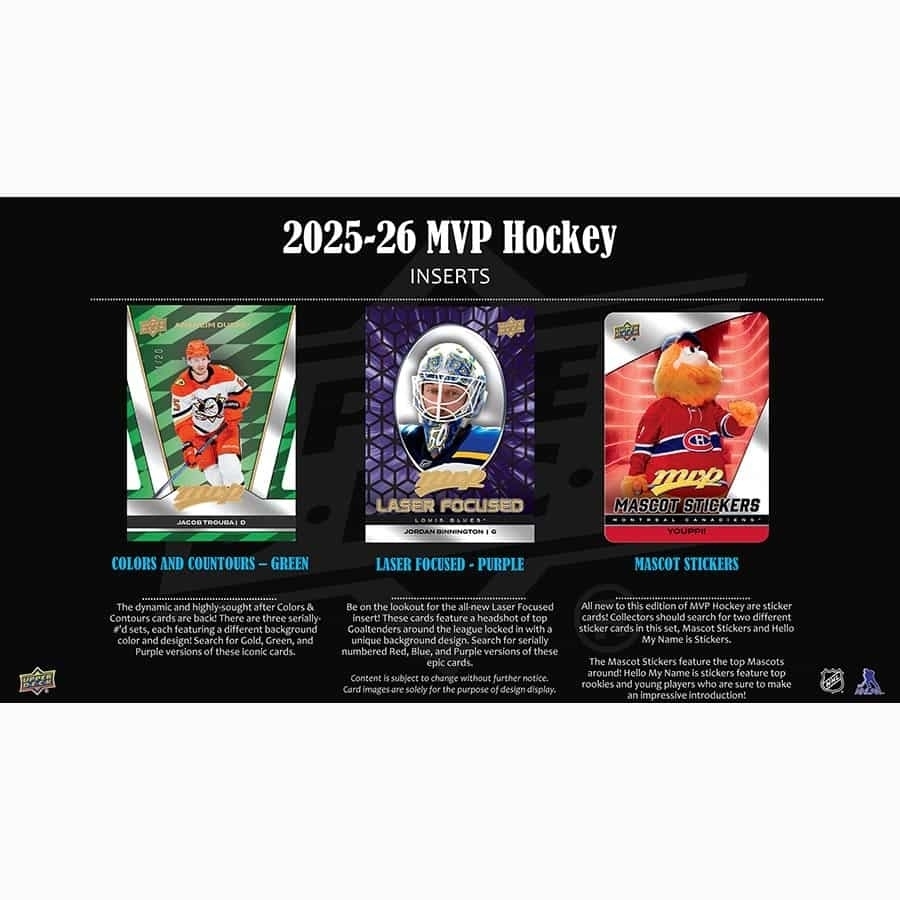 Start your 2025-26 hockey card collection with Upper Deck MVP, packed with exciting inserts, rookie content, fun sticker cards, and colorful parallels - all at a collector-friendly entry point!