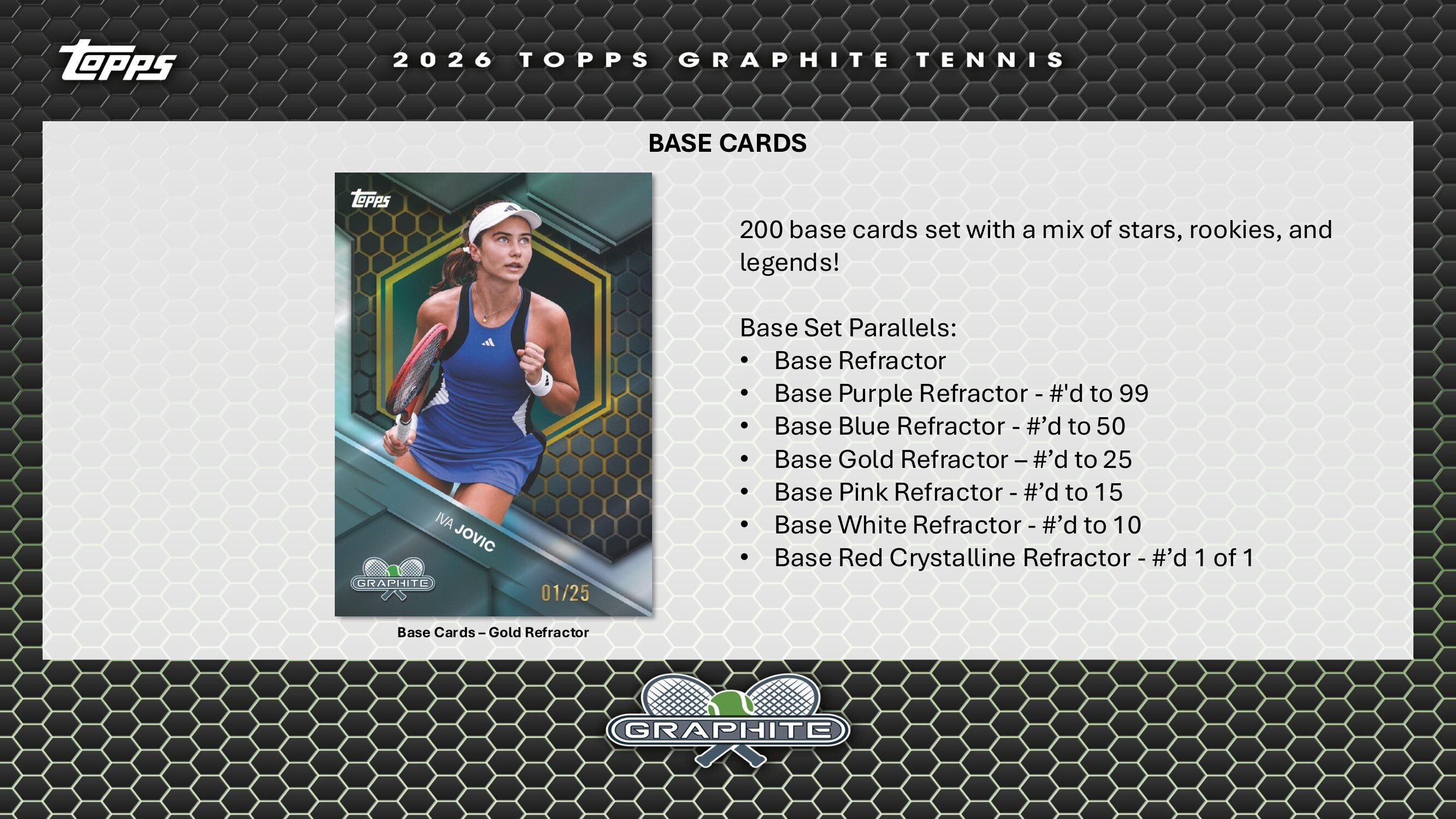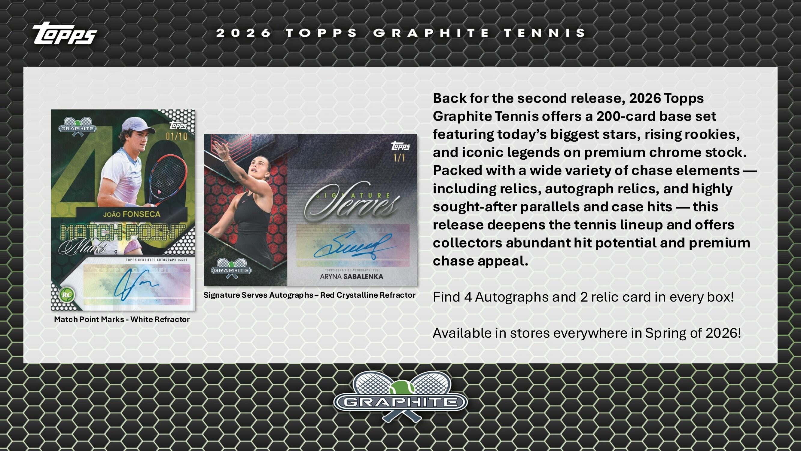 With 2026 Topps Graphite Tennis, the series returns for its second release, once again delivering premium chrome design, top-tier players, and a wide range of chase elements.
