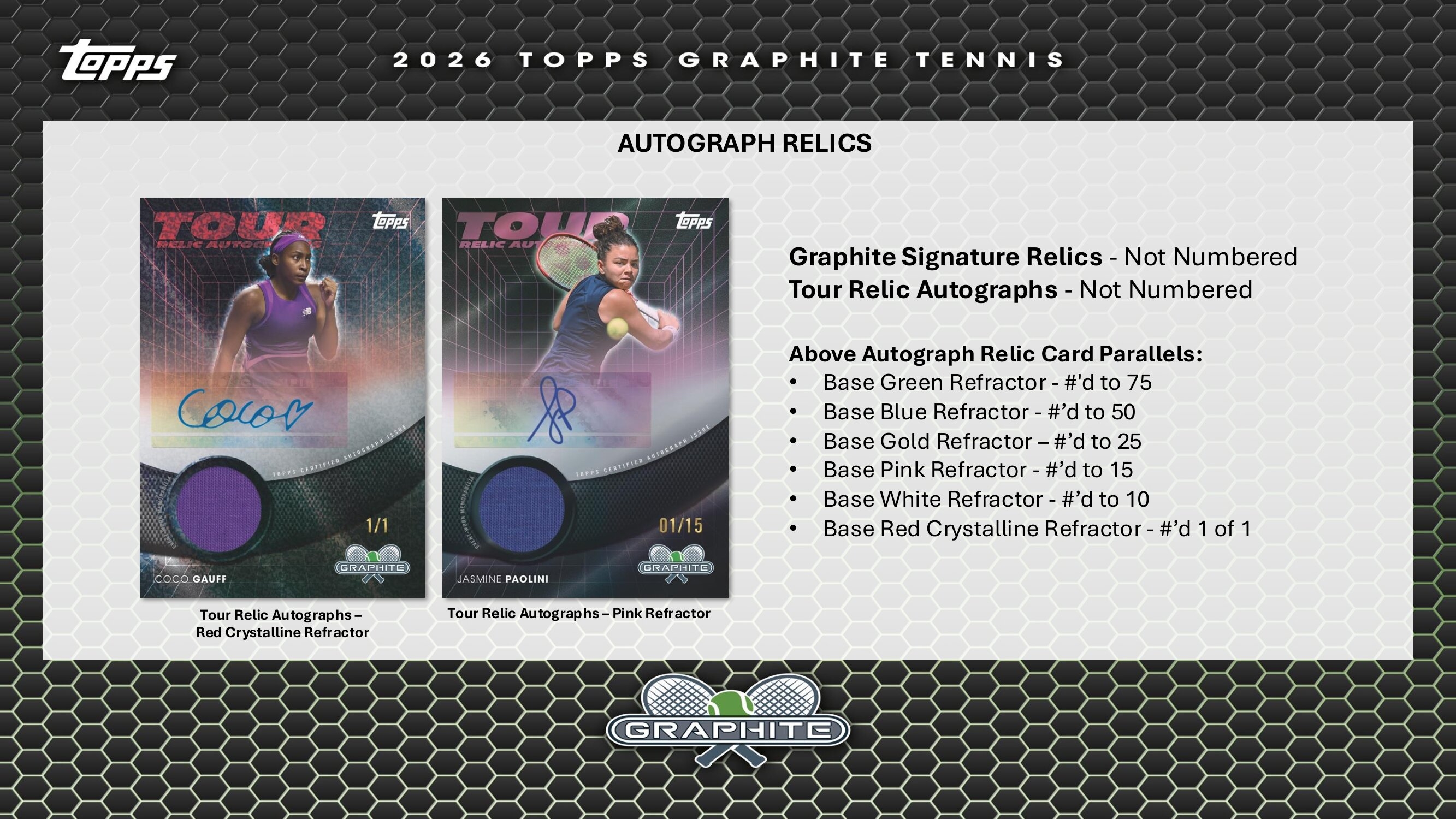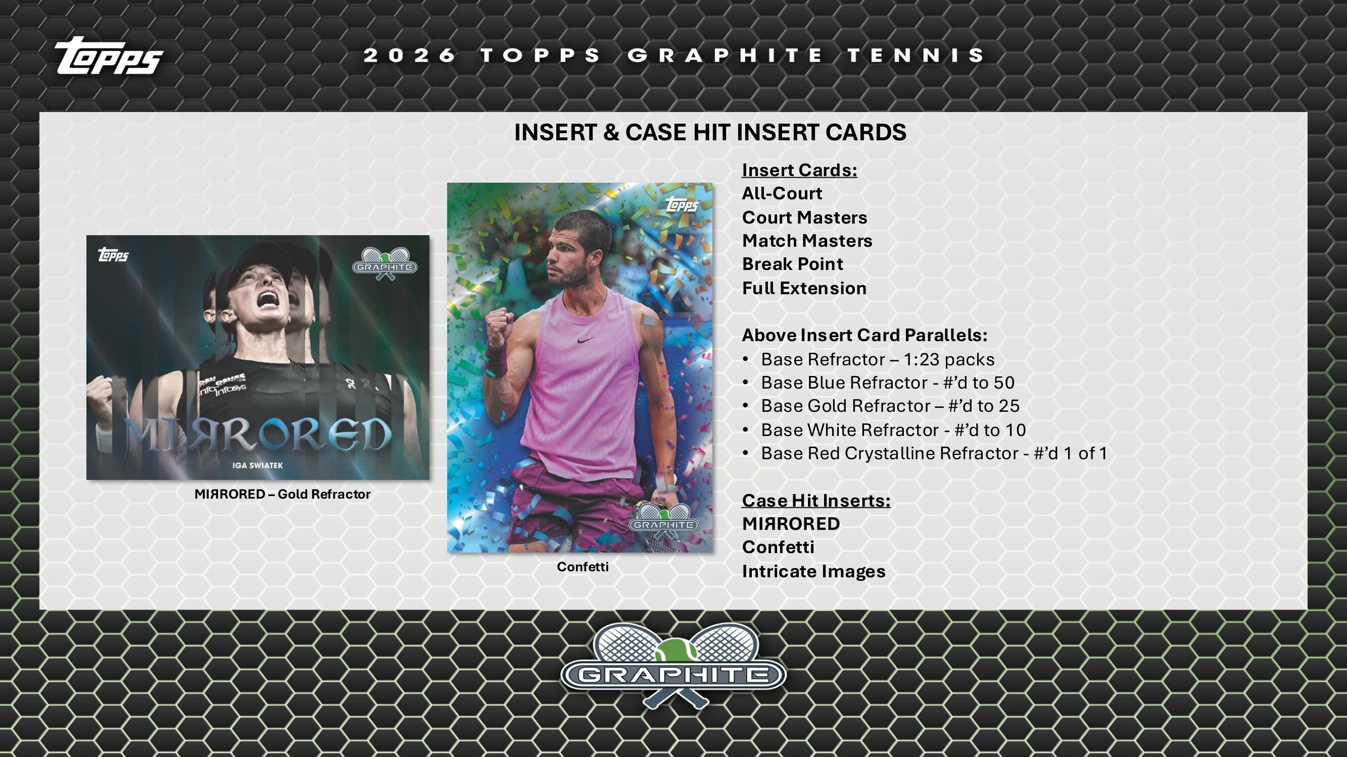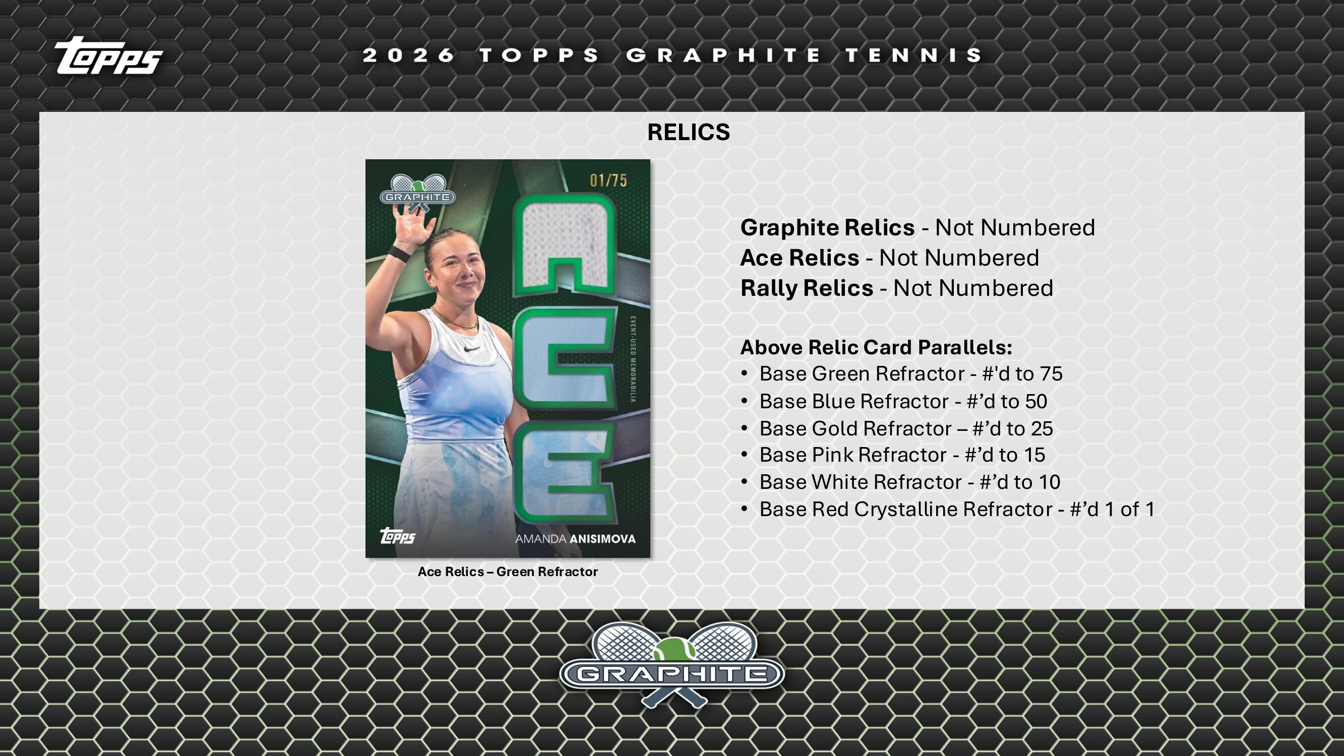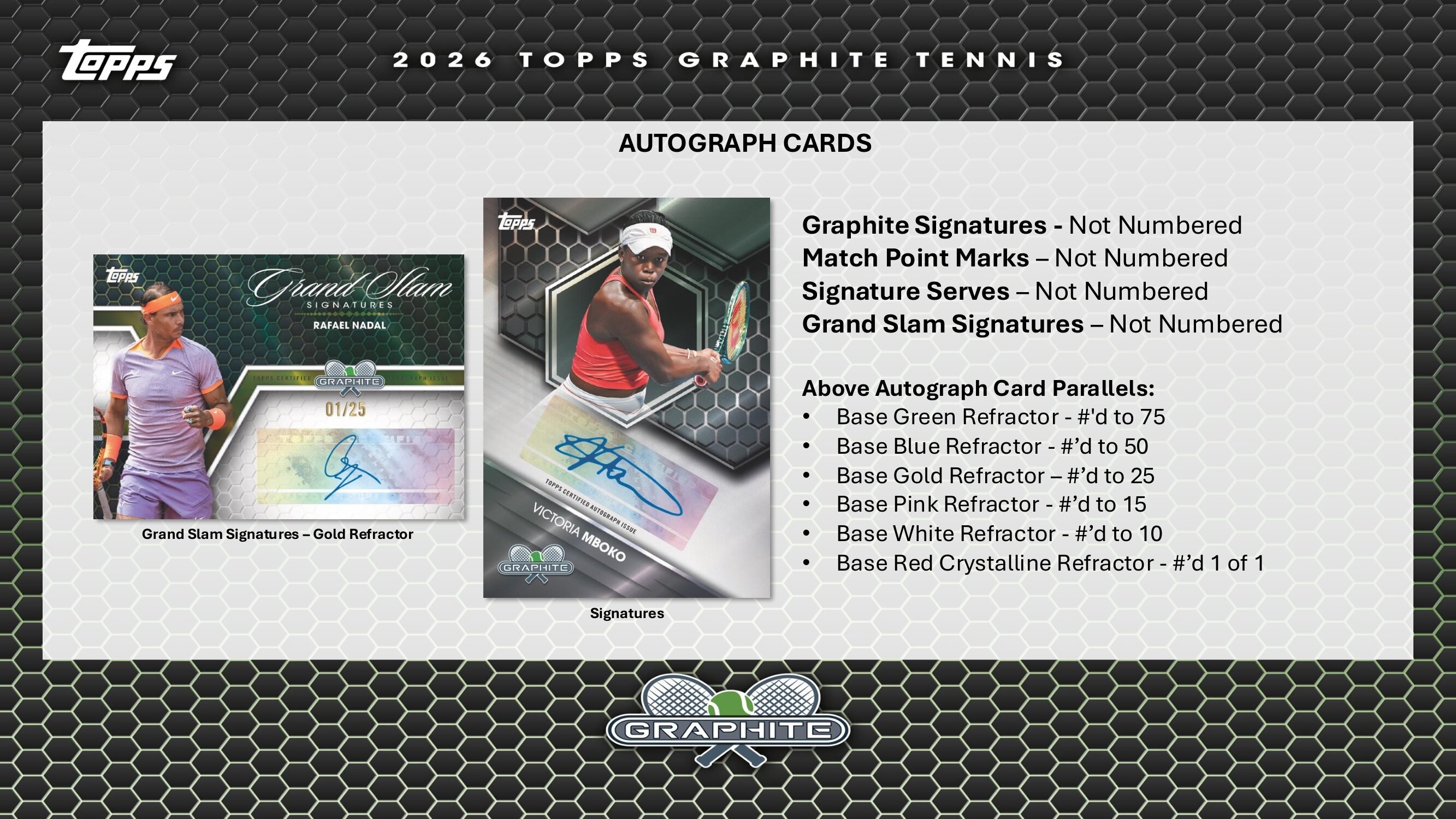 2026 Topps Graphite Tennis combines modern design with top players, diverse inserts, and a wide range of autograph and relic content, making it a premium release for tennis collectors.