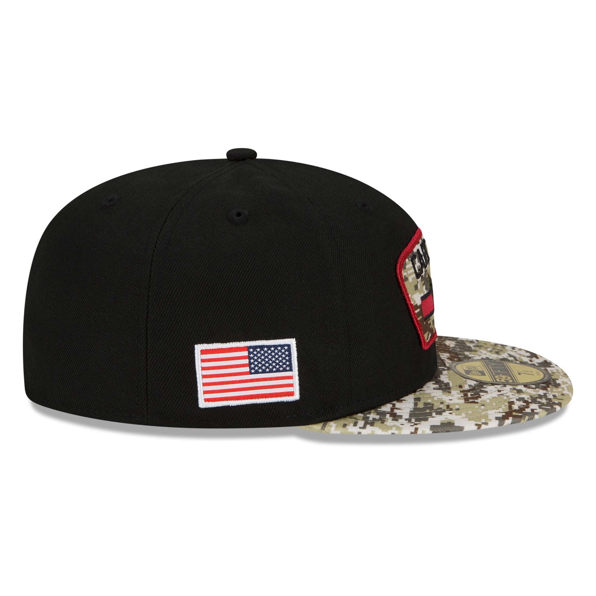 This 2021 NFL Salute to Service fitted hat is designed to support the American military branches. It features Arizona Cardinals camo team patch on front and American state flag patch embroidered on right side. Rear decoration features NFL Salute to Service ribbon. Additional details include a digital camo visor.