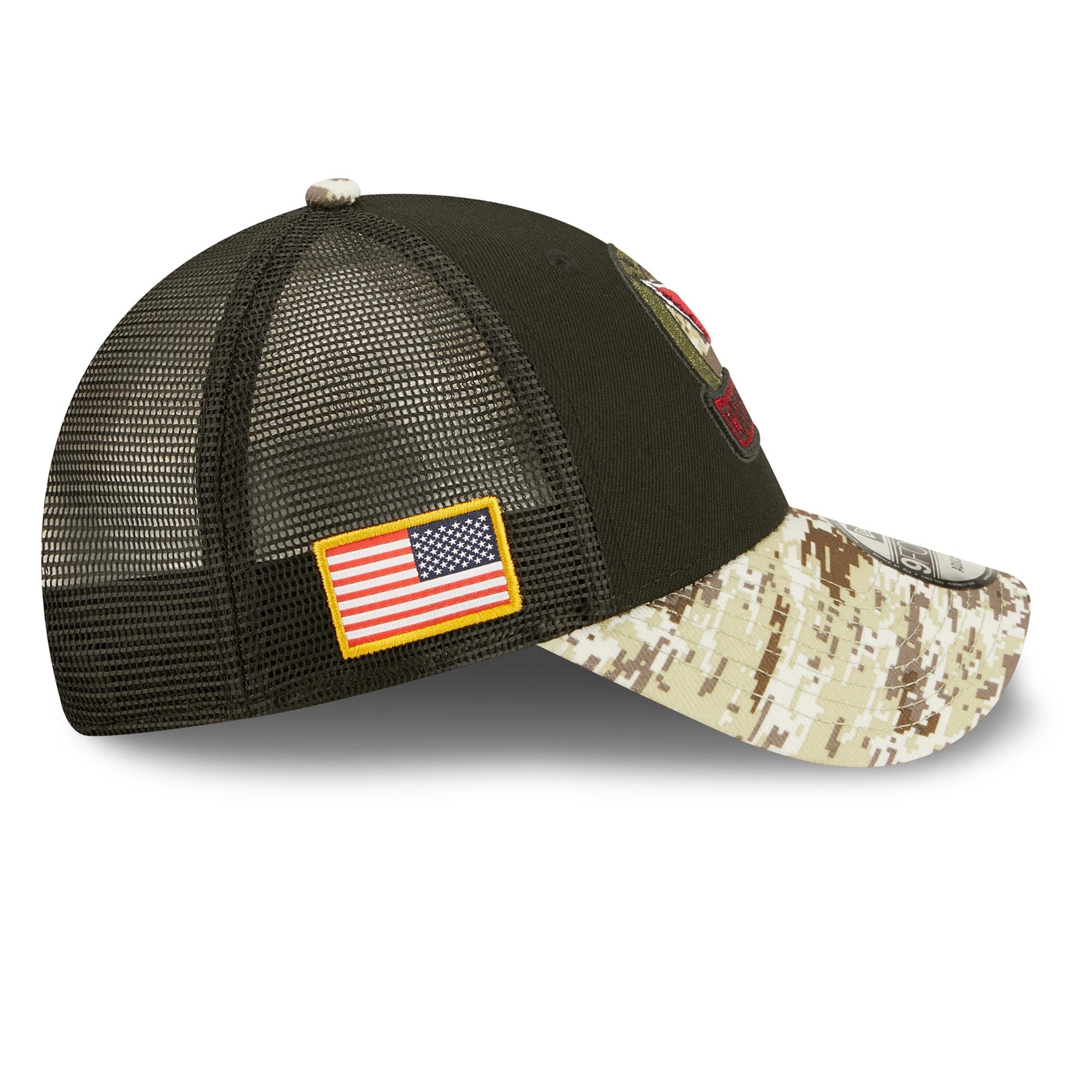 This 2022 NFL Salute to Service adjustable hat is designed to support the American military branches. It features a classic trucker mesh back and Arizona Cardinals special edition team logo on front. American state flag patch embroidered on right side. Rear decoration features NFL Salute to Service ribbon. Additional details include a digital camo visor.