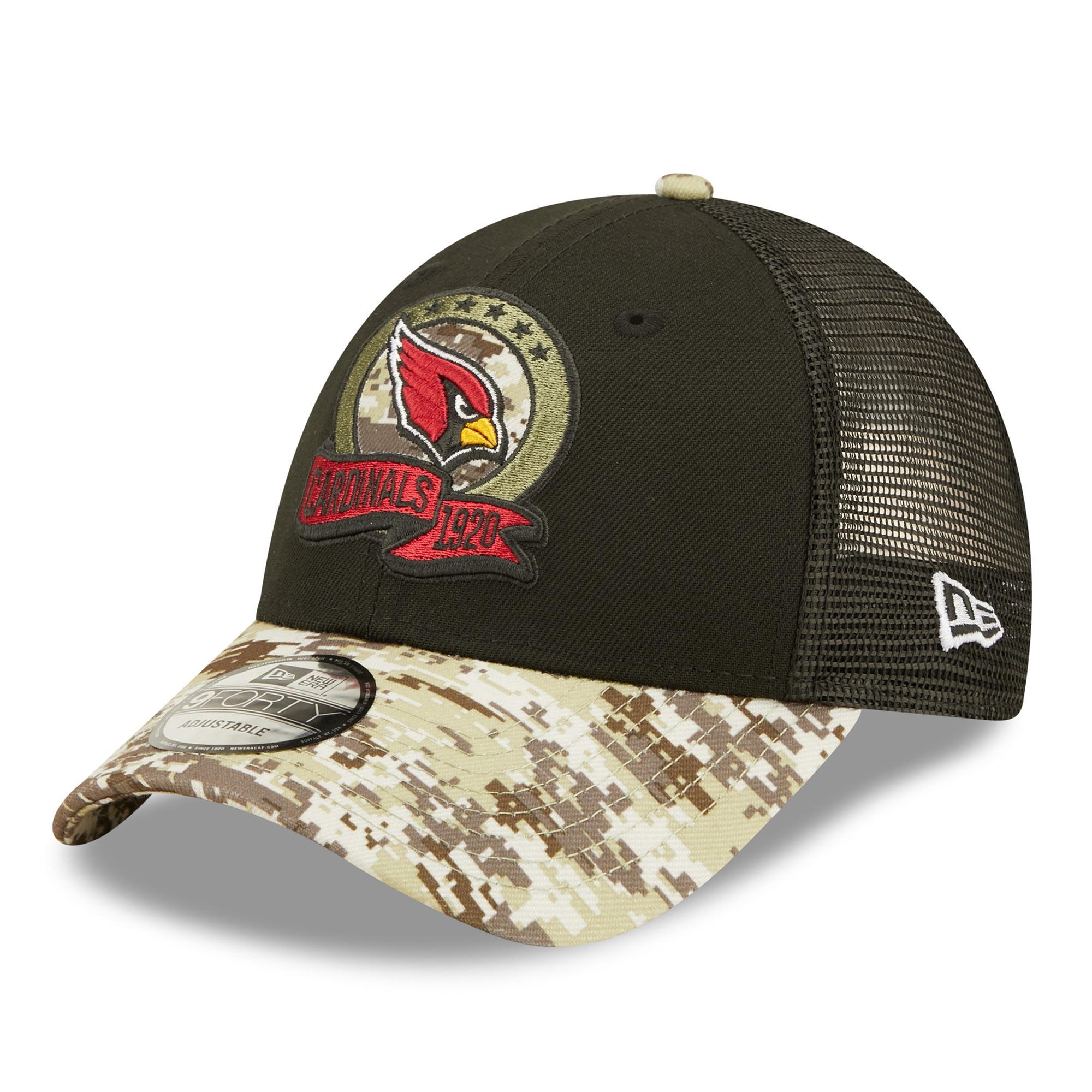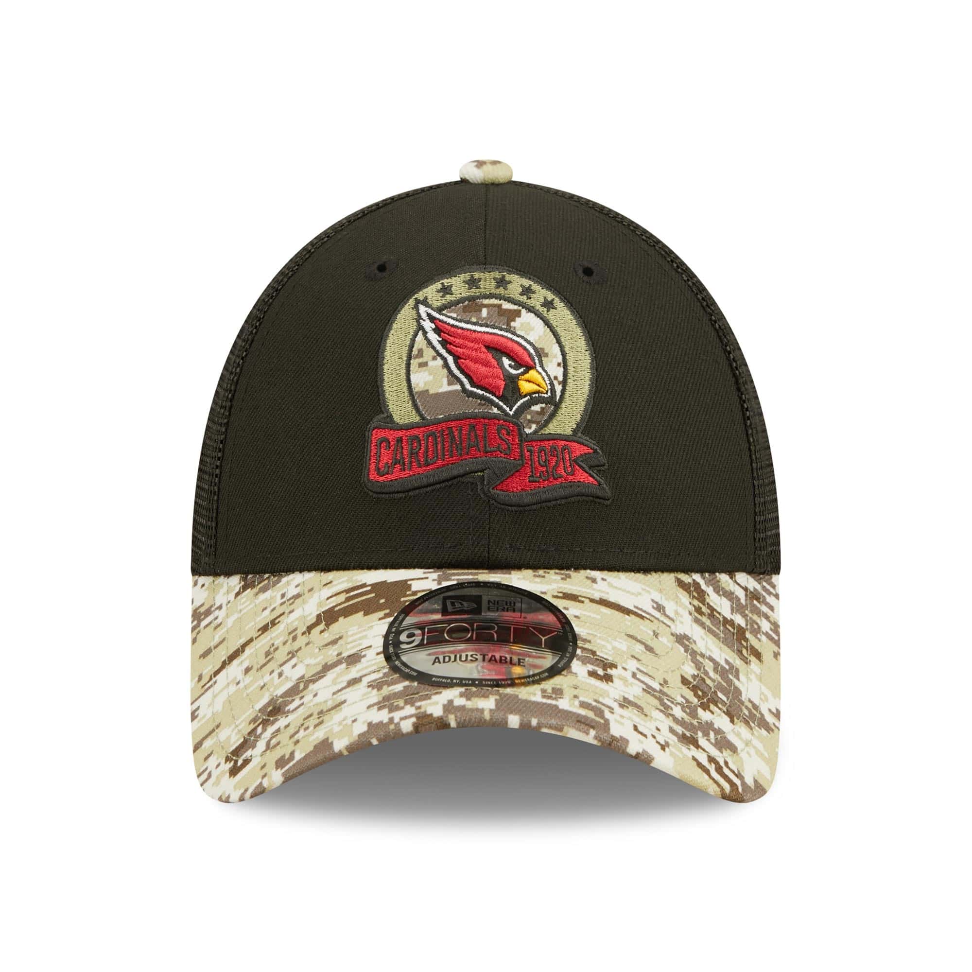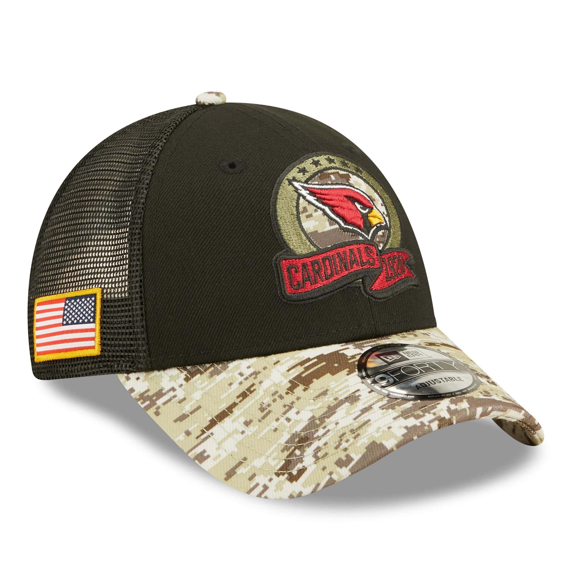 New Era American Football 9FORTY Trucker Adjustable Cap from your Arizona Cardinals. 2022 NFL On-Field Salute to Service Edition.