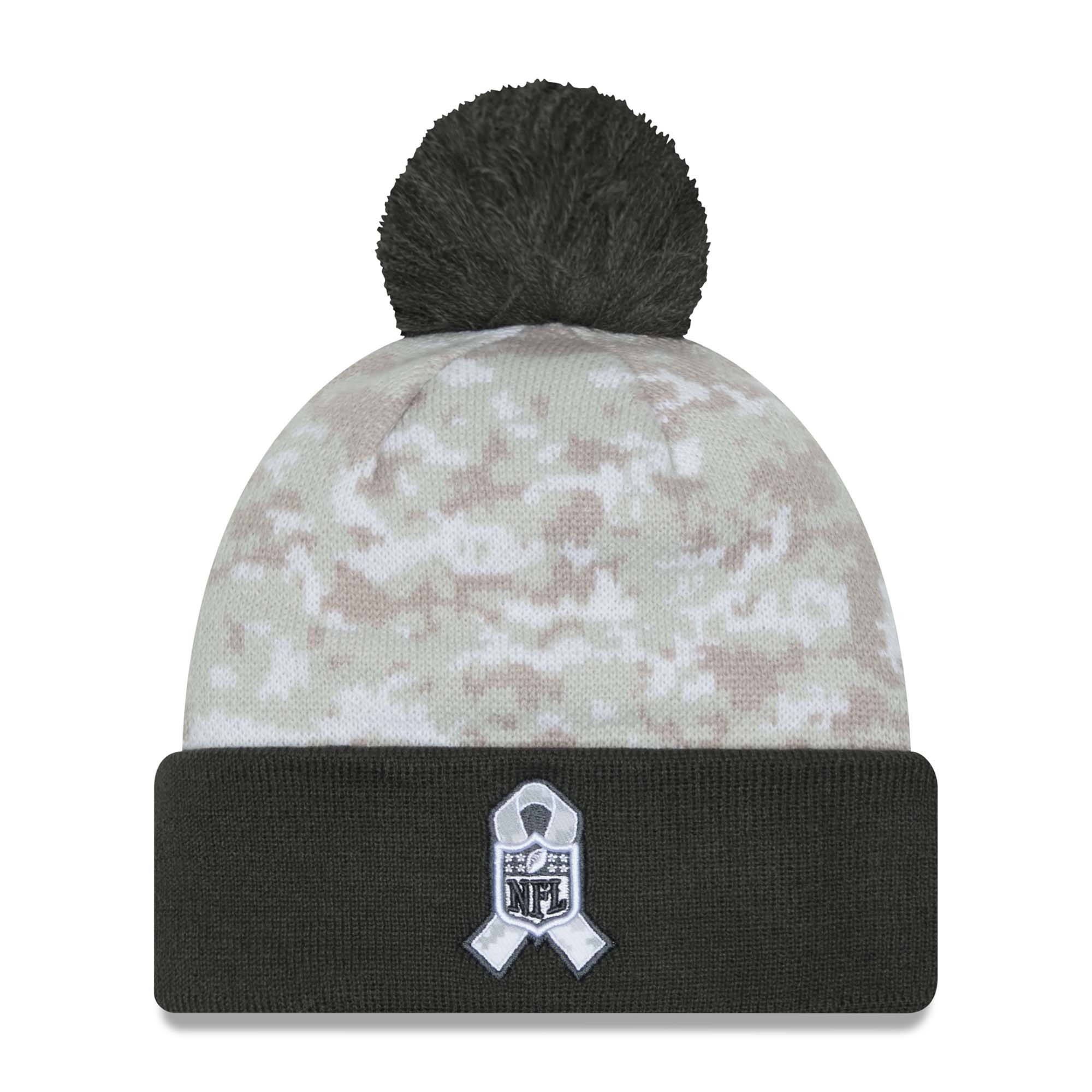 The New Era 2024 NFL On-Field Salute to Service Sport Winter Beanie is more than just a stylish accessory - it makes a statement of appreciation. The beanie impresses with its high-quality design: an embroidered team logo decorates the front cuff, while the American flag patch on the right side and the Salute to Service NFL Shield on the back add extra accents. The camouflage crown gives the beanie a distinctive look, and the removable pom-pom detail completes the design.