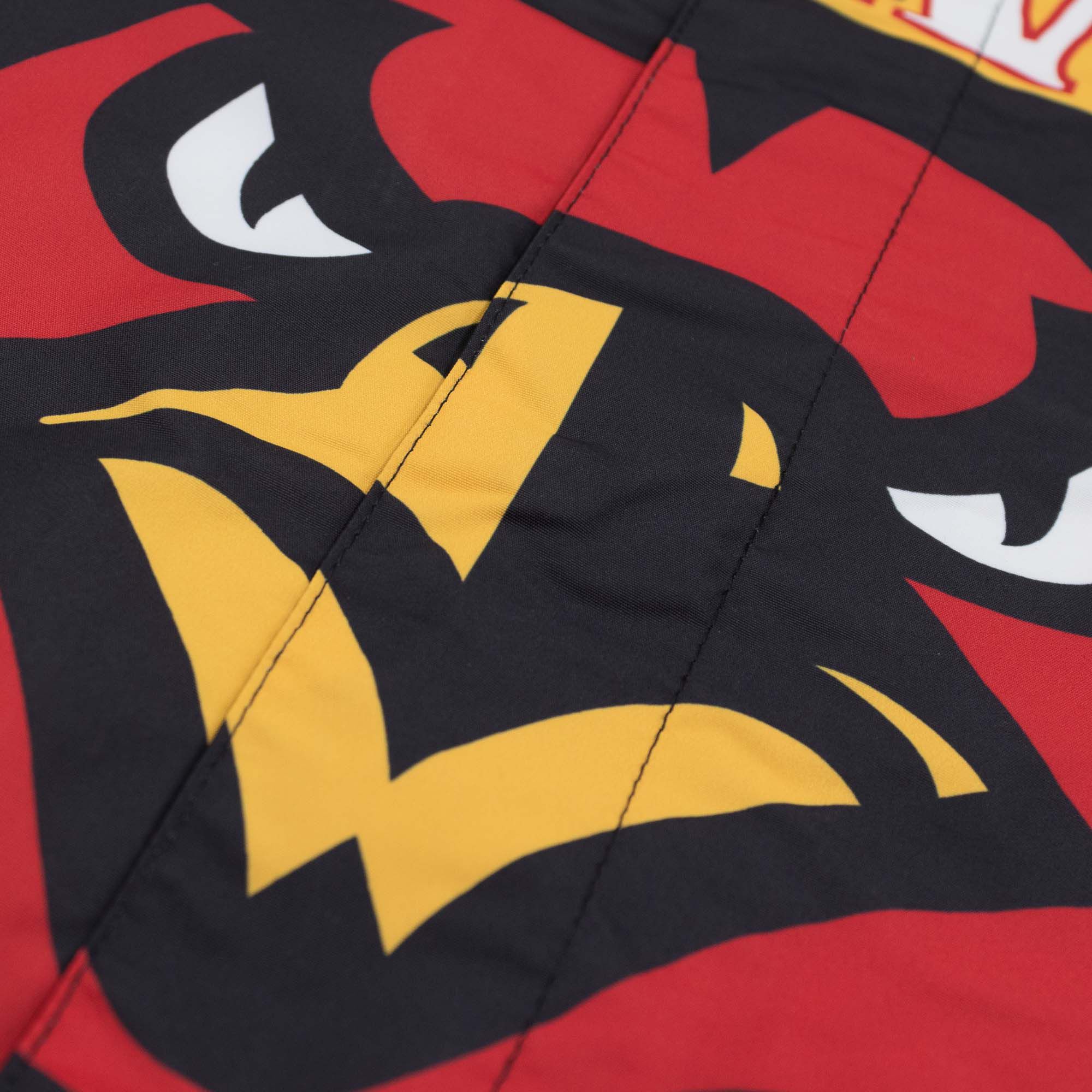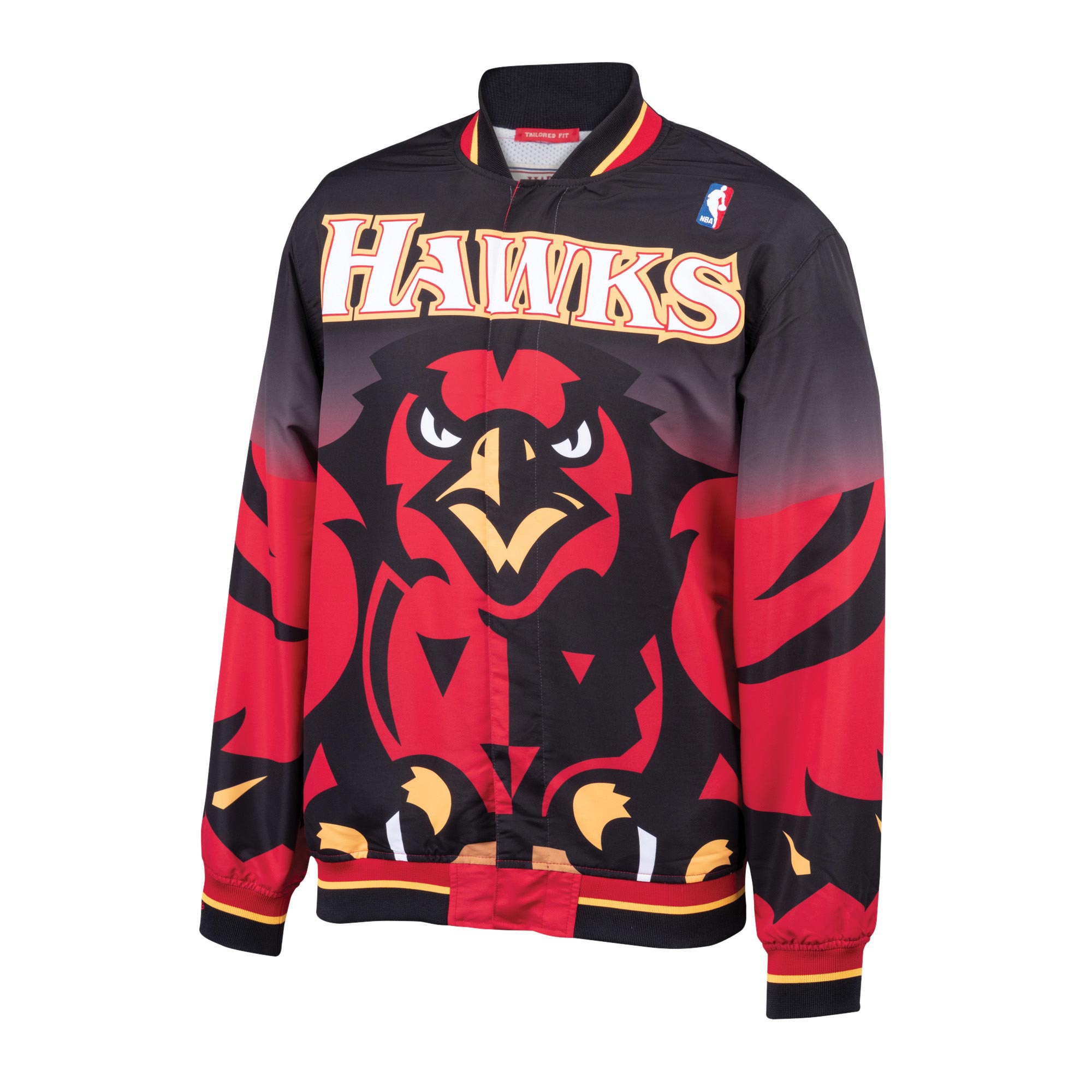 The nylon jacket features mesh lining to keep you cool and feeling fresh. An embroidered NBA league logo is found on the upper right chest, while the team name and year ID tag is sewn into the back waistband. Atlanta Hawks retro team graphics cover front, sleeves and back. Other features include 1×1 rib trim on the collar, sleeves and waistband, side pockets, as well as a center snap closure. Mitchell & Ness lettering embroided on right cuff. This jacket is tailored fit, meaning it fits slimmer in the body.