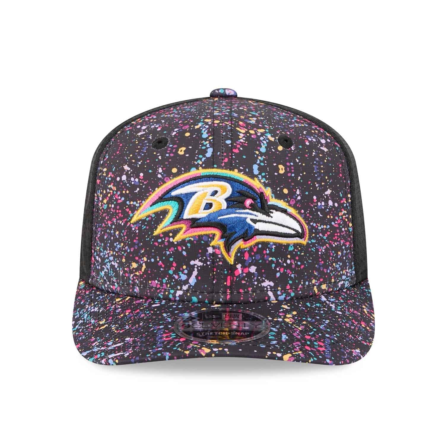 - Embroidered Baltimore Ravens logo on the front in multicolor Crucial Catch style