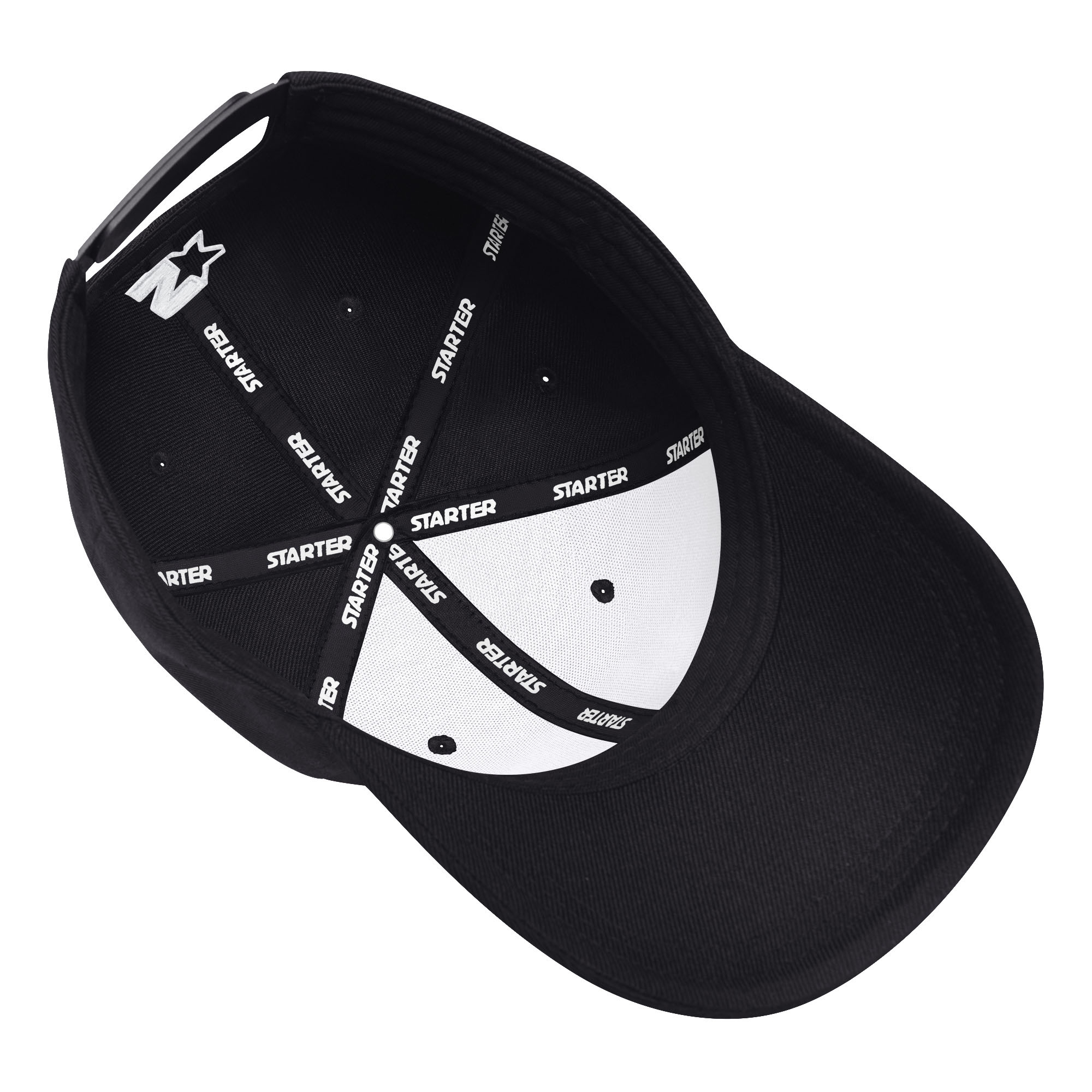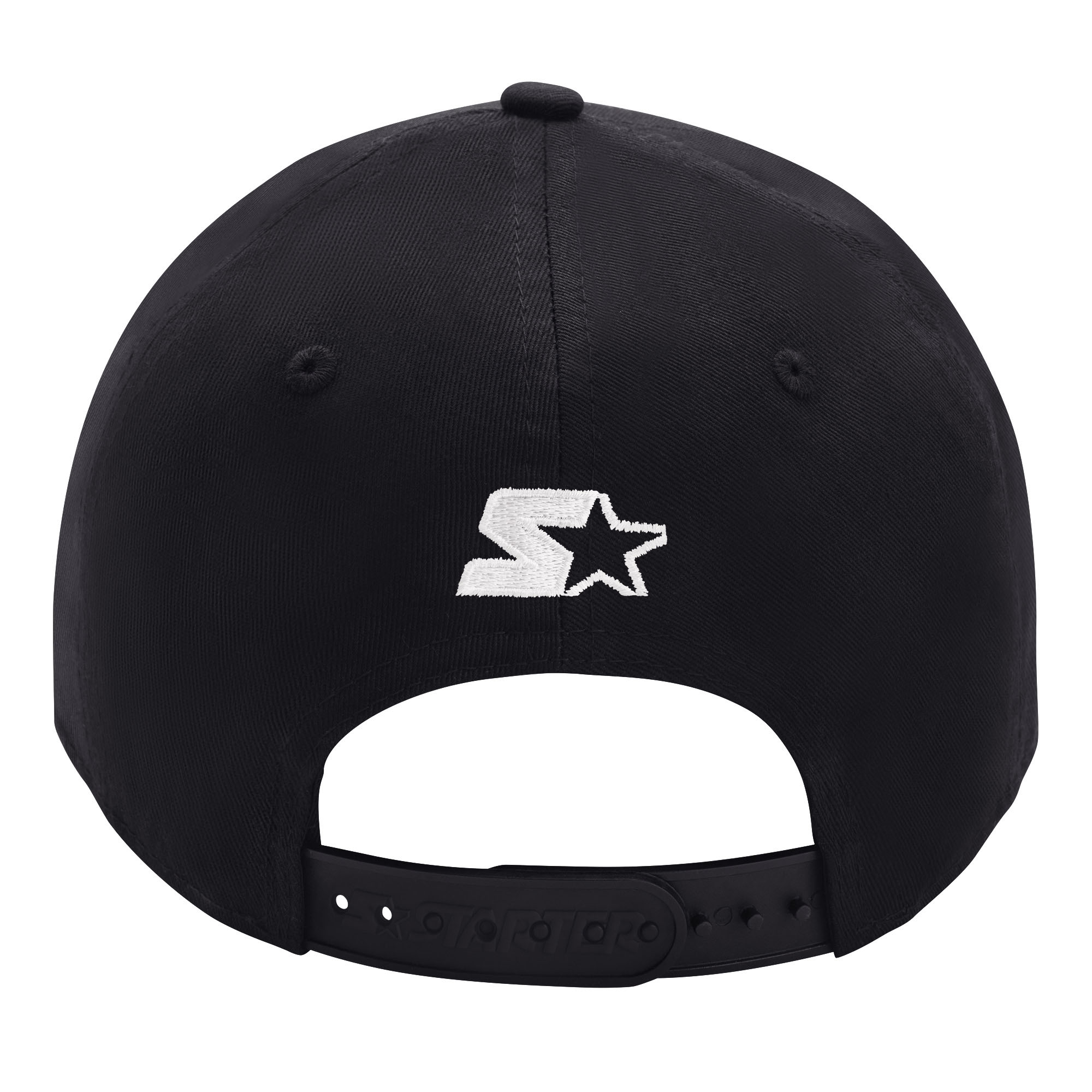 Starter Snapback fit with a high structured crown and small, pre-curved visor. Starter logo embroidered on back. Stitched eyelets for breathability. Snapback closure for easy size adjustment.