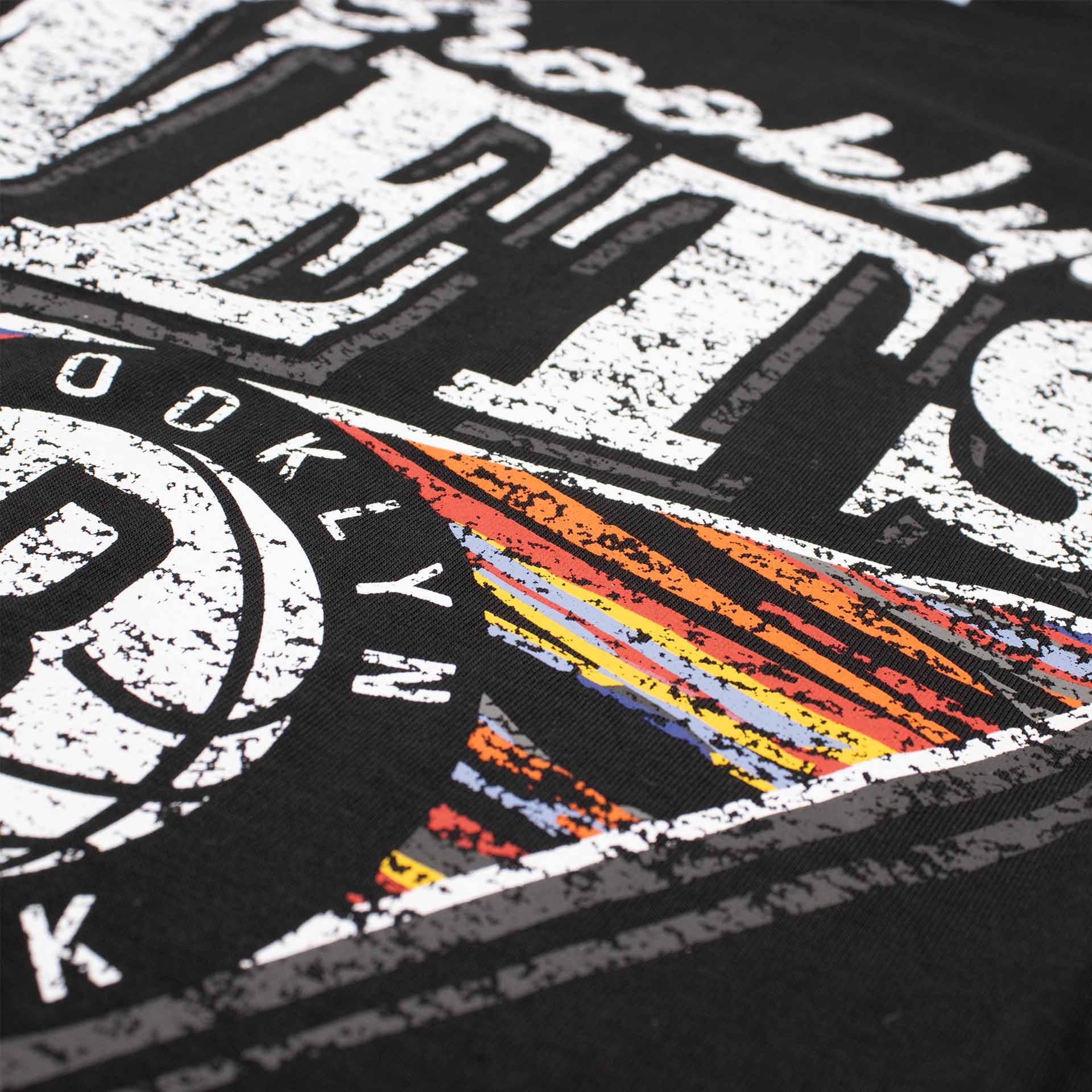 - Large vintage-style front print with classic Brooklyn Nets lettering and basketball graphic