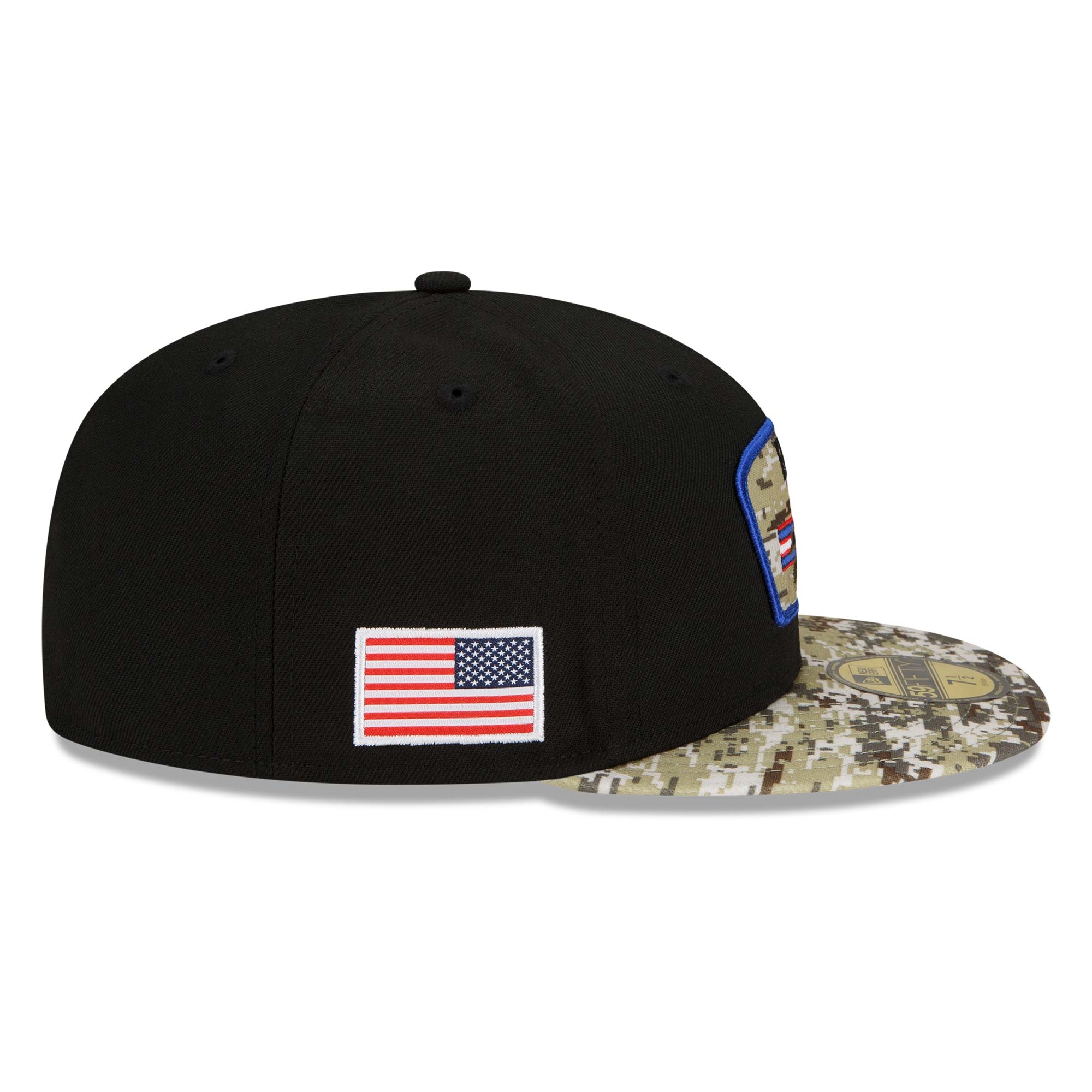 This 2021 NFL Salute to Service fitted hat is designed to support the American military branches. It features Buffalo Bills camo team patch on front and American state flag patch embroidered on right side. Rear decoration features NFL Salute to Service ribbon. Additional details include a digital camo visor.