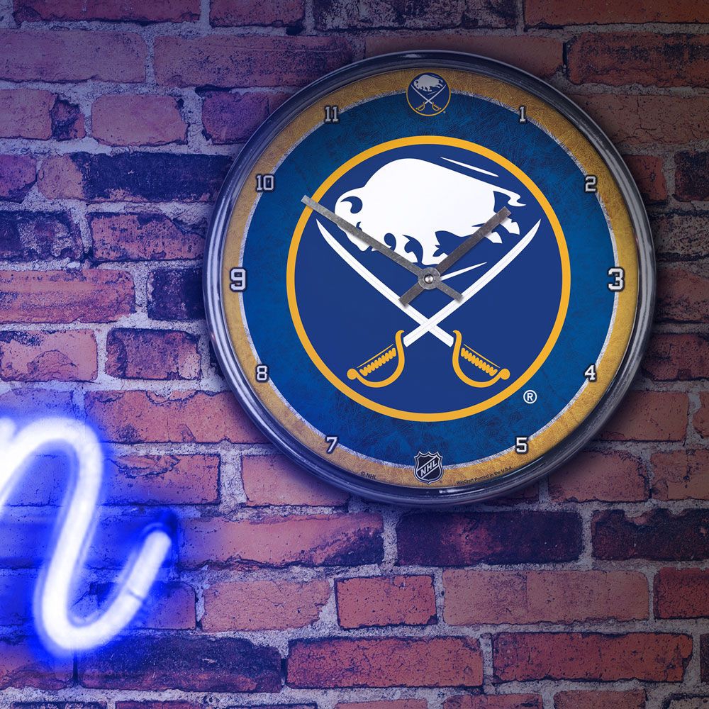 The WinCraft Chrome plated NHL clock is both a retro classic, and a trendy find for a wall clock. Stunning Buffalo Sabres graphics with a metal hands make a great fit in any fan cave, office, bar, or bedroom.